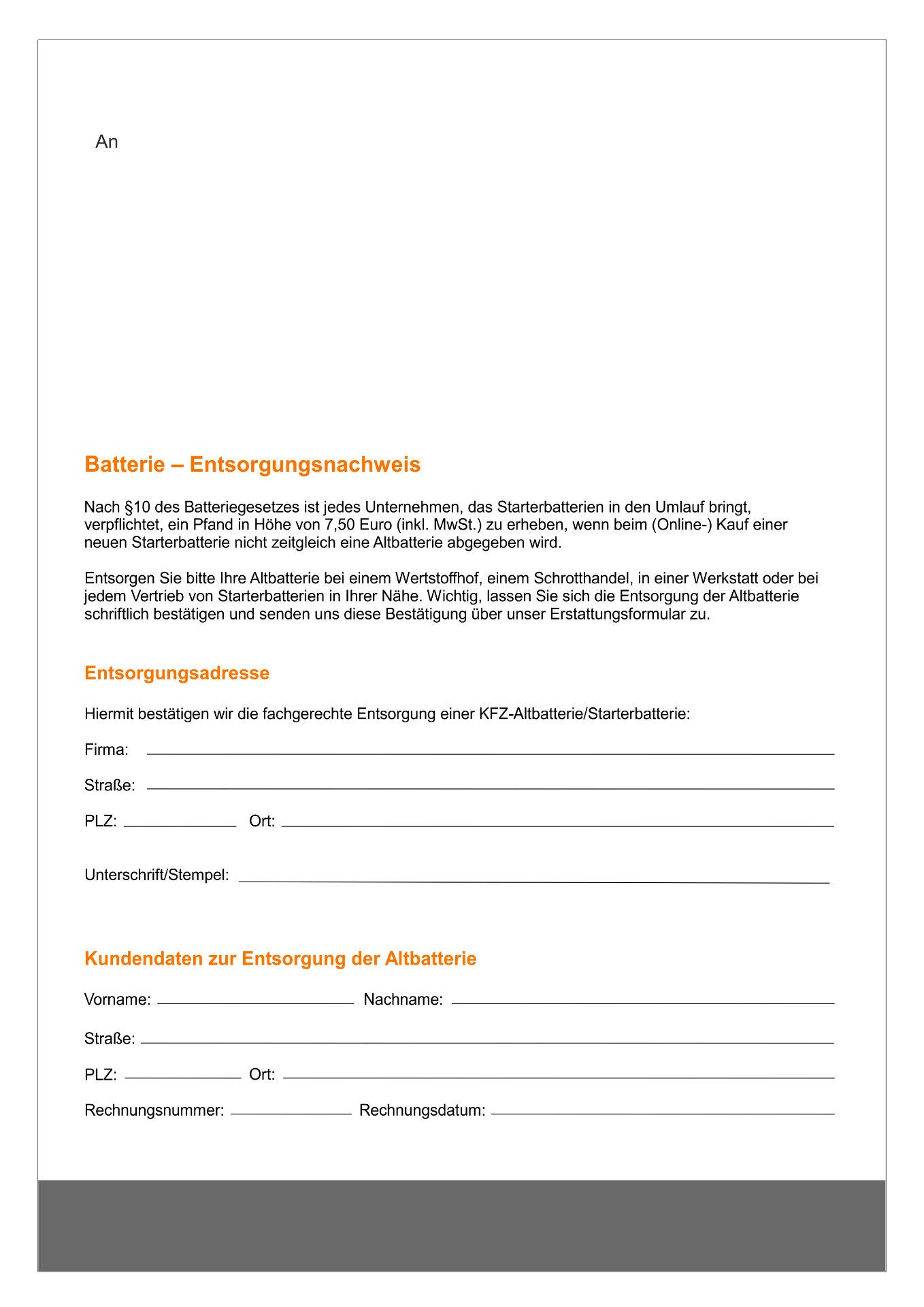 Hallo, ich gebe die alten Akkus bei uns im Wertstoffhof ab und lasse mir das auf einem von mir modifizierten Formular aus dem Netz bestätigen. Diese Bestätigung faxe oder maile ich zum Verkäufer und ich habe bislang mein Geld immer erhalten.