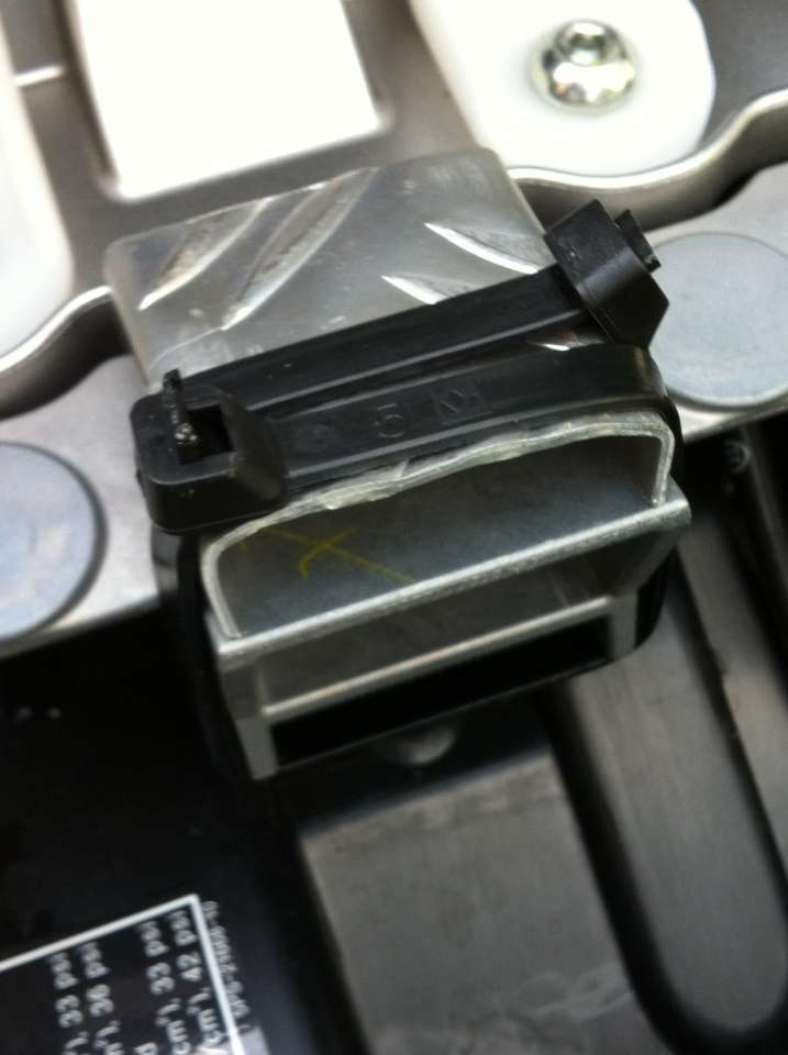 Seitlich helfen auch Fischertechnik-Elemente (rot im Bild) den Rahmen später auf dem Heck zu zentrieren, da die eigentlichen Pins nun in der Luft hängen. Die beiden so entstandenen Distanzstücke habe ich passgenau mit Heißkleber unter den Hilfrahmen geklebt. Der Verschlusshaken an der Sitzbank musste ebenfalls um 1,5 cm verlängert werden, damit er anschließend wieder ins Schloss passte. Hier ein Bild meiner feinwerklichen Meisterleistung, die so gut schließt, wie das Orignial. Für die hintere Aufnahme der Sitzbank (weiße Kunststoffnase) musste ein Profilstück der vorhandenen Fassung nachempfunden werden und im Abstand von 1,5 cm ob auf die vorhandene Aufnahme montiert werden. Wie man sieht, hält auch hier das Provisorium sehr ordentlich: zwei dicke Kabelbinder tun ihren Dienst