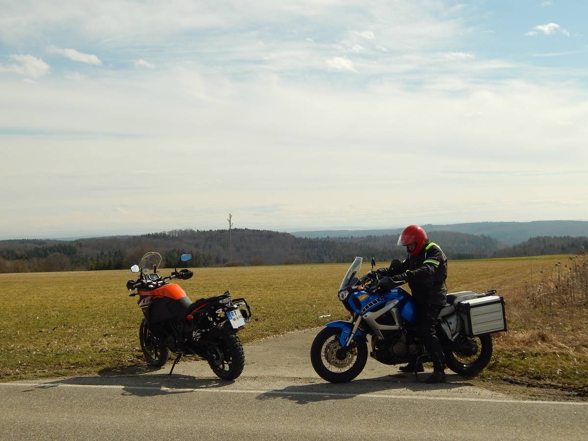 Eine kleine Runde ums Gäu gebollert, seine hatte 24 Kilometer auf dem Tacho als er zu mir kam, und da er sie noch einfahren muss, bin ich hinterher gefahren, die hat vielleicht gestunken. Na ja beim Probesitzen meinte er, da sitz man gut, vor allem bei seiner Größe passt er besser auf meine als auf seine, besonders der Kniewinkel ist auf der XT besser, wir werden ja nicht jünger. Blick von der Alb übers Allgäu in die Berge. Grüßle Älbler