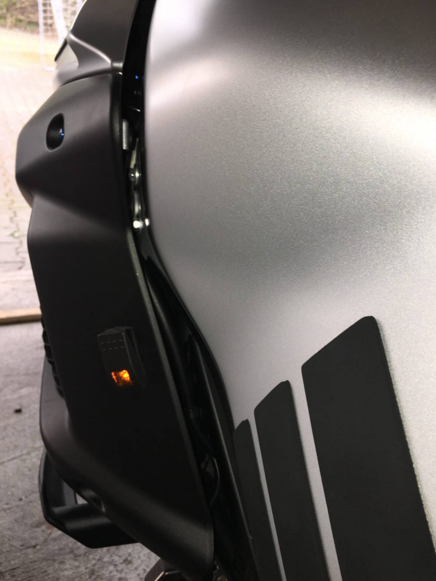 Die beleuchteten Schalter (in den Seitendeckeln rechts u. links) musste ich nach der ersten Fahrt um 180° drehen, da in voller Montur meine Knie immer wieder mal den Schalter umlegten. Das passiert nun nicht mehr. Die Schalter mussten allerdings wegen ihrer Einbautiefe in dieser (für die Knie) recht ungünstigen Position angebracht werden.
