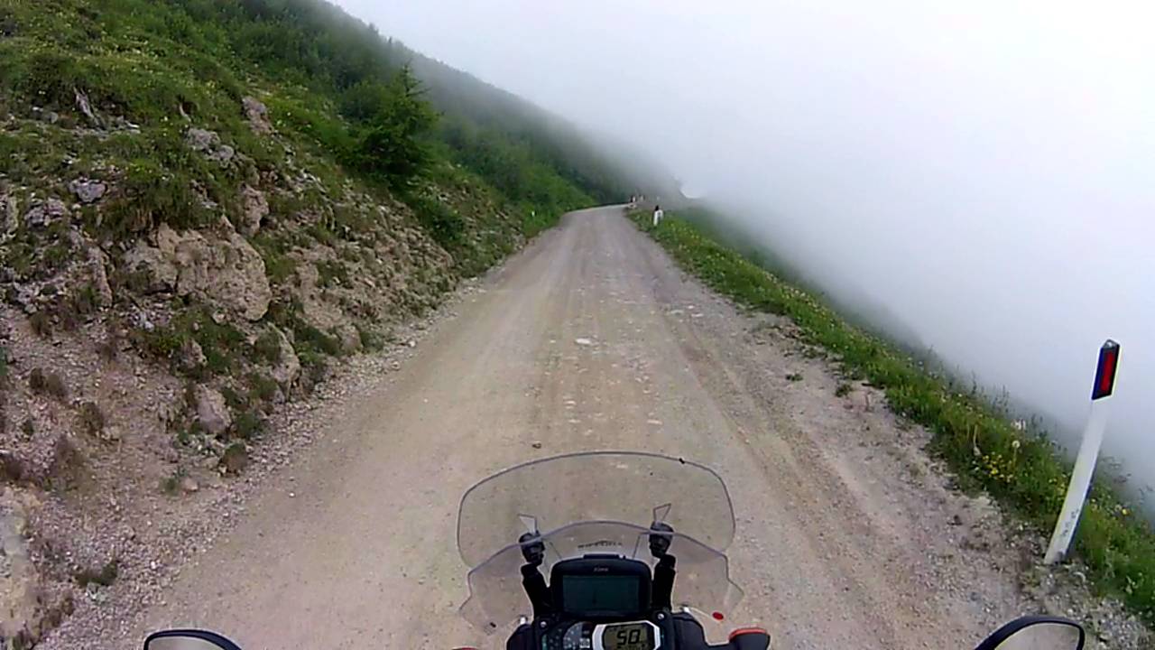 Ich kann mich an eine Tour vor ein paar Jahren erinnern, es war so um Vatertag 2012, da lag oben am Dosso Alto/Maniva noch Schnee und zwischen Weg und Abhang gab es abschnittsweise eine Durchfahrtsbreite von vielleicht 1,5 m. Reicht locker, klar, aber für meine Frau war es eine der ersten Touren überhaupt als Sozia. Ich hab sie dann sicherheitshalber absteigen lassen...