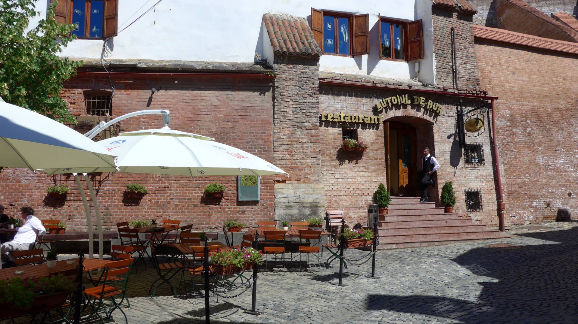 Aber wir hatten Glück und nun einen Ruhetag. Um 15.00 Uhr machten wir uns auf den „anstrengenden“ Weg in die Altstadt. Bei sonnigen 26 Grad schafften wir es gerade so bis zur ersten Eisdiele. Nach dem Eis sind wir die Altstadt abgelaufen. Da diese nicht sonderlich groß ist, ging das relativ zügig. Wir setzten uns in ein Café und schauten uns die Menschen an, die herumliefen. Die Zeit verging wie im Flug und ruckzuck war es 17.30 Uhr. Klaus knurrte bereits der Magen. Markus hatte sich von einem Arbeitskollegen (Rumäne) die Adresse des Restaurants „Golderen Büffel“ geben lassen. Die Kneipe war schnell gefunden und wir setzten uns ins Lokal nicht in den Biergarten. Die Speisekarte „sprach“ auch Deutsch und ich bestellte mir die lokale Spezialität „Rumänisches Gulasch mit Brotknödeln“. Das Essen war so gut wie in unserer fränkischen Heimat. Wir wechselten noch das Lokal und saßen bis abends beim Bier (fără alcool) und guckten Menschen.