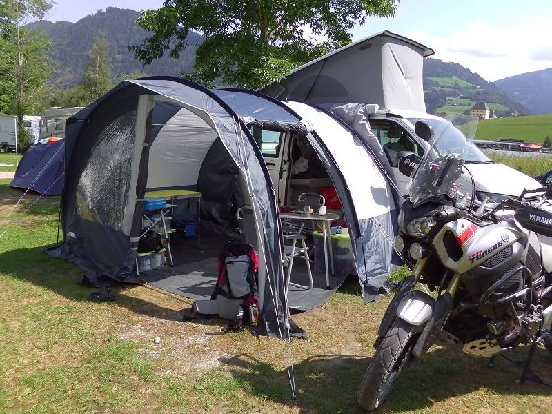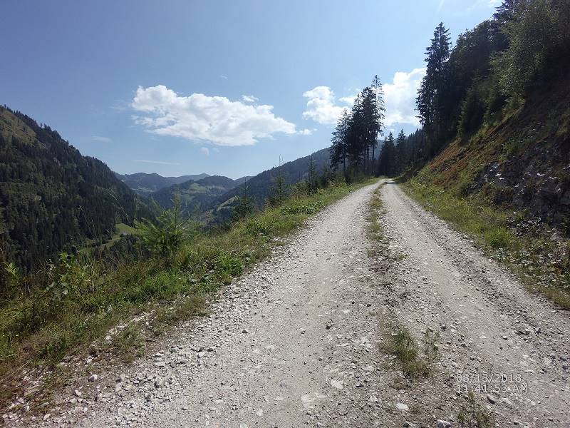 Abenteuerliche Anfahrt zur Hütte: knapp 12 km Anfahrt auf Sträßchen dieser Beschaffenheit, mit "netten" Spitzkehren 2. Woche mit Basiscamp auf dem Campingplatz in Aigen (Ennstal) am Putterersee (25°C Wassertemperatur).