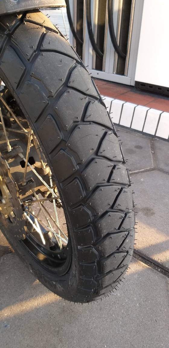Bis jetzt sind's knapp 2000km mit diesen Reifen. Der Grip auf leichtem Matsch, Schotterpisten, nassen Feldwegen, Gras und auf der Straße, sind bis jetzt hervorragend.