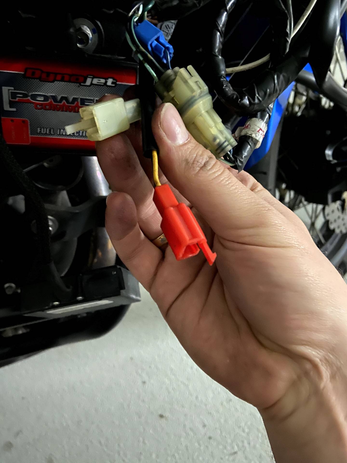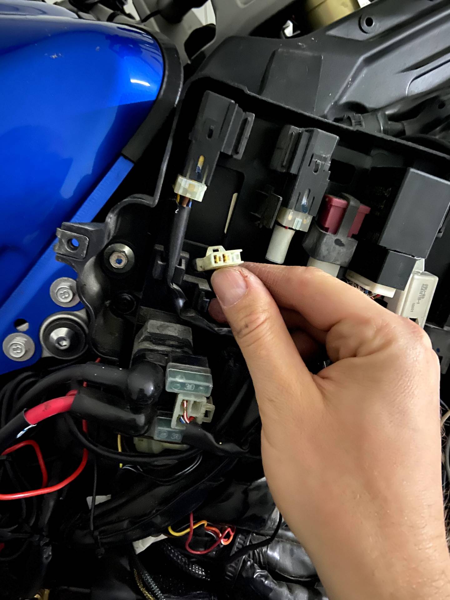 Das zweite und auch wesentlich aufwändigere Problem, war ein unfassbarer Kabelsalat des Vorbesitzers. Selbst mein Freund als 2-Rad-Mechaniker hat nicht verstanden warum das Ganze so komisch verkabelt wurde (siehe Bilder 5,6). Das Problem war, dass bei Zündung an der rechte Zusatzscheinwerfer auf Dauer-An war und der linke nicht geleuchtet hat, obwohl Strom ankam. Der Ein/Aus Schalter hat funktioniert, da das Relais geschalten hat.