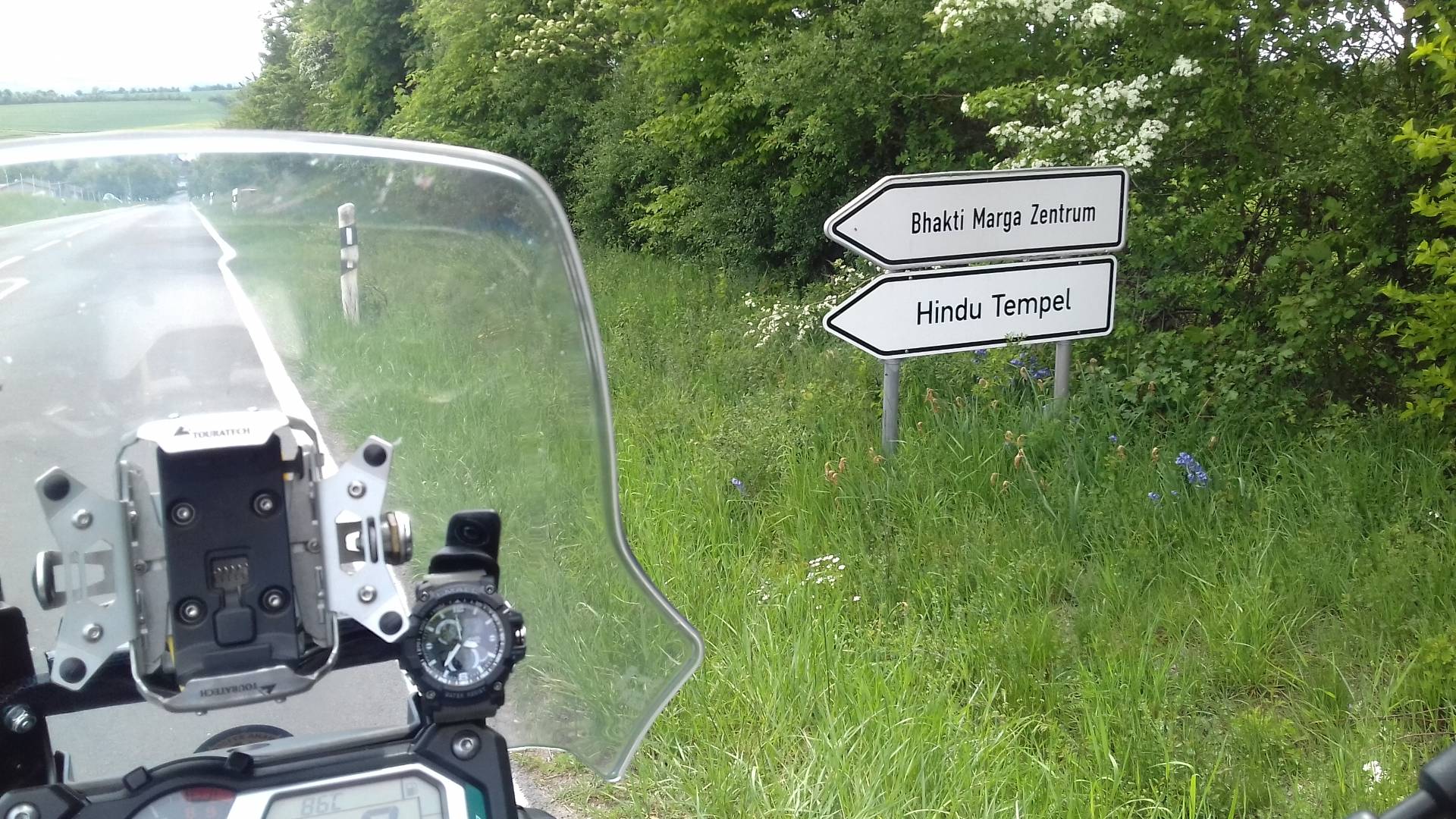 Das sonnendurchflutete Tal der Ach mit blauem Mopped unter blauem Himmel vor saftigem Grün und der Bahnlinie Ulm-Sigmaringen, das gefällt mir besser als Werkstattgerümpel.