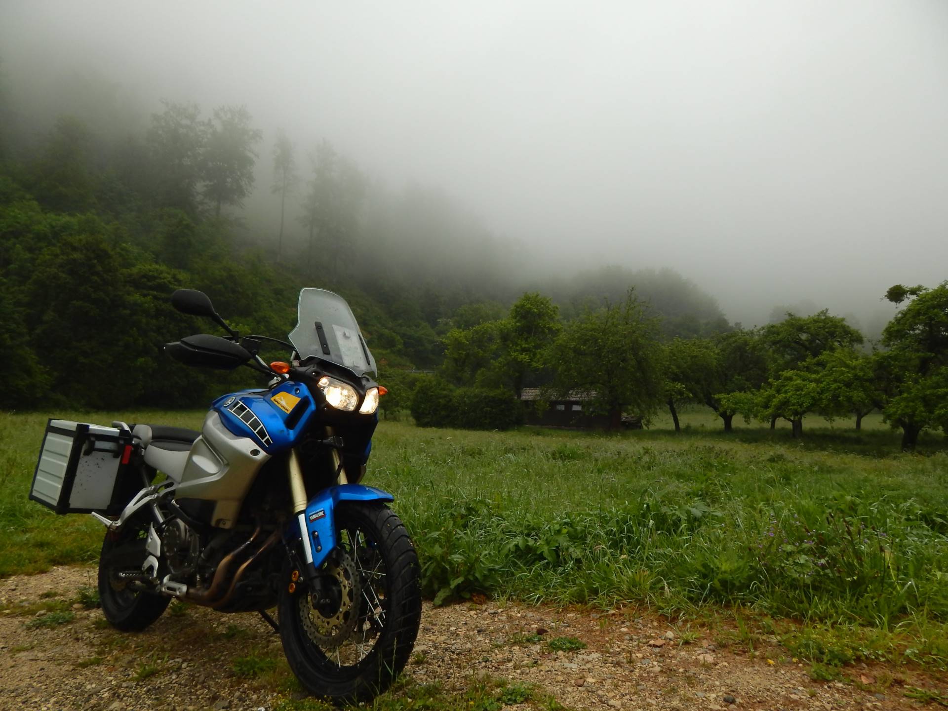 Zwischendurch ein Tagesaktuelles Bild, viel Motorradfahrer trifft man nicht bei diesem Wetter, aber was gibt es schöneres wie auf dem Moped sitzen, nichts sehen als Nebel, den Straßenverlauf erahnen - dann und wann schälen sich Büsche und Bäume aus dem Nebel, der Regen klopft fein ans Visier, und zwischen zwei Herzsschlägen glauben - alles ist gut.
