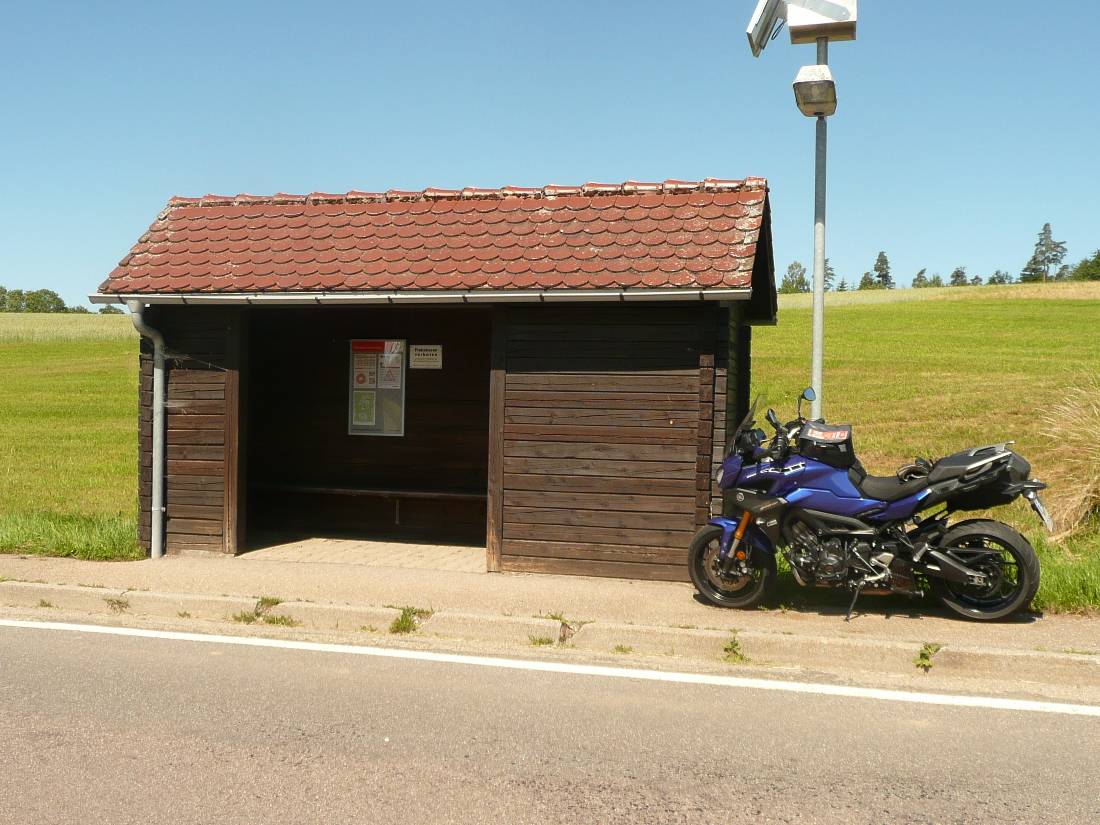 Überdachte Bank im stillen Murrhadter Wald, na ja, auf allen vier Seiten der Äcker.