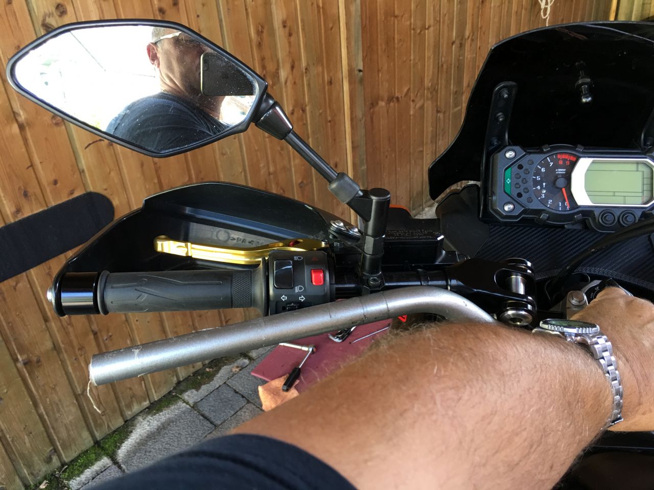 Er passt auch ohne Lenkererhöhung, allerdings ist dann nur wenig Platz zwischen Tank und "Lenker Stoßdämpfer".