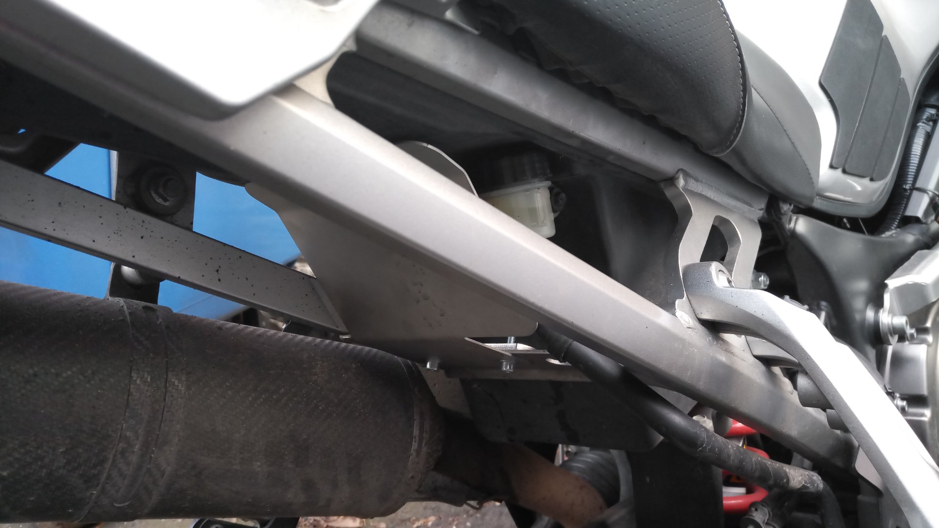 Ein bisschen was hat sich wieder getan. Die oberen Handschutzerweiterungen sind dran, dazu von DS Bike Protection die Abdeckung für die Wasserpumpe, die Abdeckung vom hinteren Hauptbremszylinder/Fersenschutz rechts und die Abdeckung für den Ausgleichsbehälter vom hinteren Bremskreislauf.