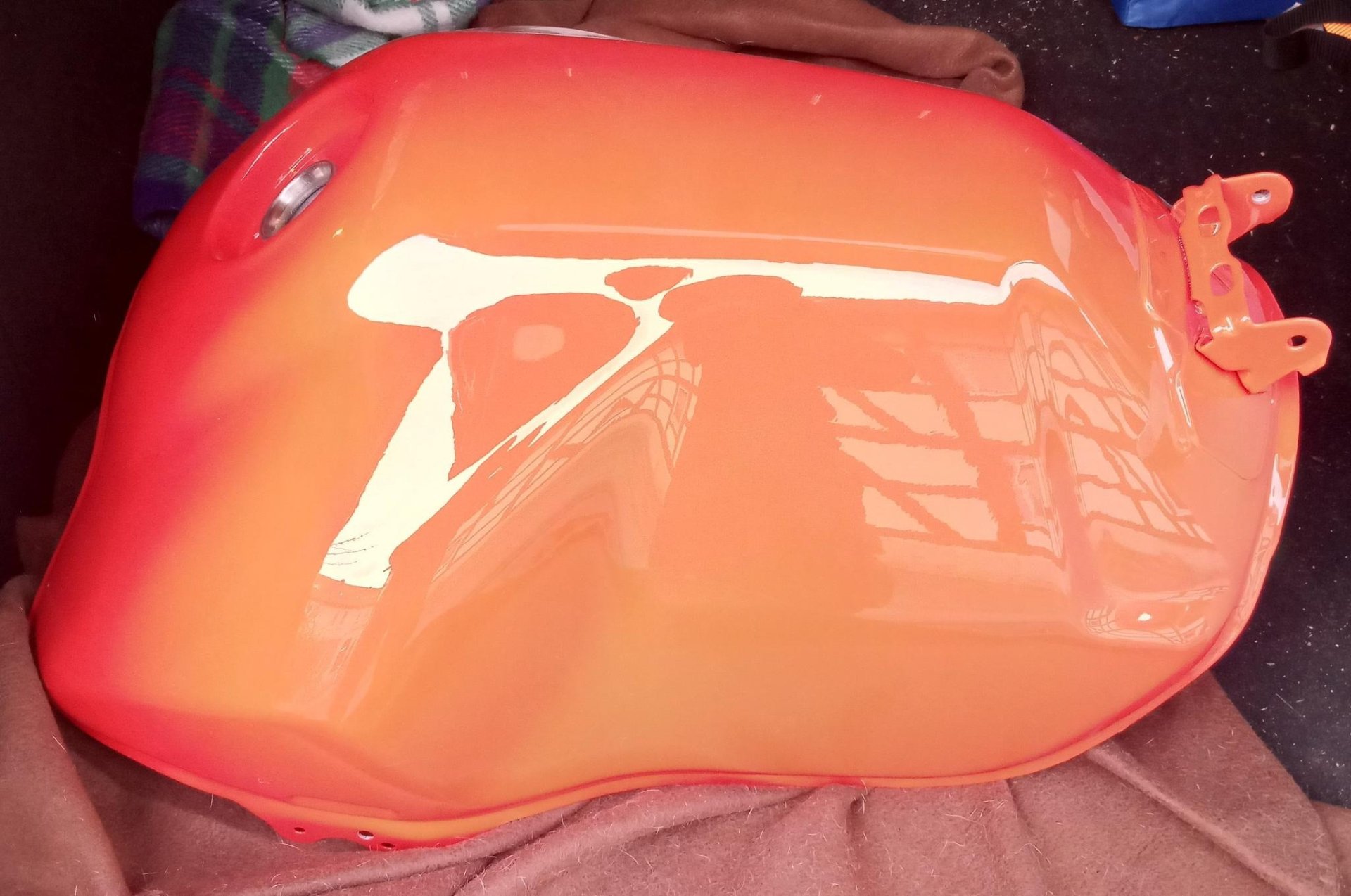 Bei meiner ist der Stand jetzt wie folgt: Maschine steht ohne Tank in der Garage, Tank liegt neu lackiert im Kofferraum vom Auto, weil das Rostproblem unterm Tankkeder doch inzwischen arg war. Der leicht orangefarbene Eindruck kommt von den miesen Lichtverhältnissen und davon, dass ich keine vernünftige Kamera zur Hand hatte. Ist komplett in einem kräftigen Hellrot.