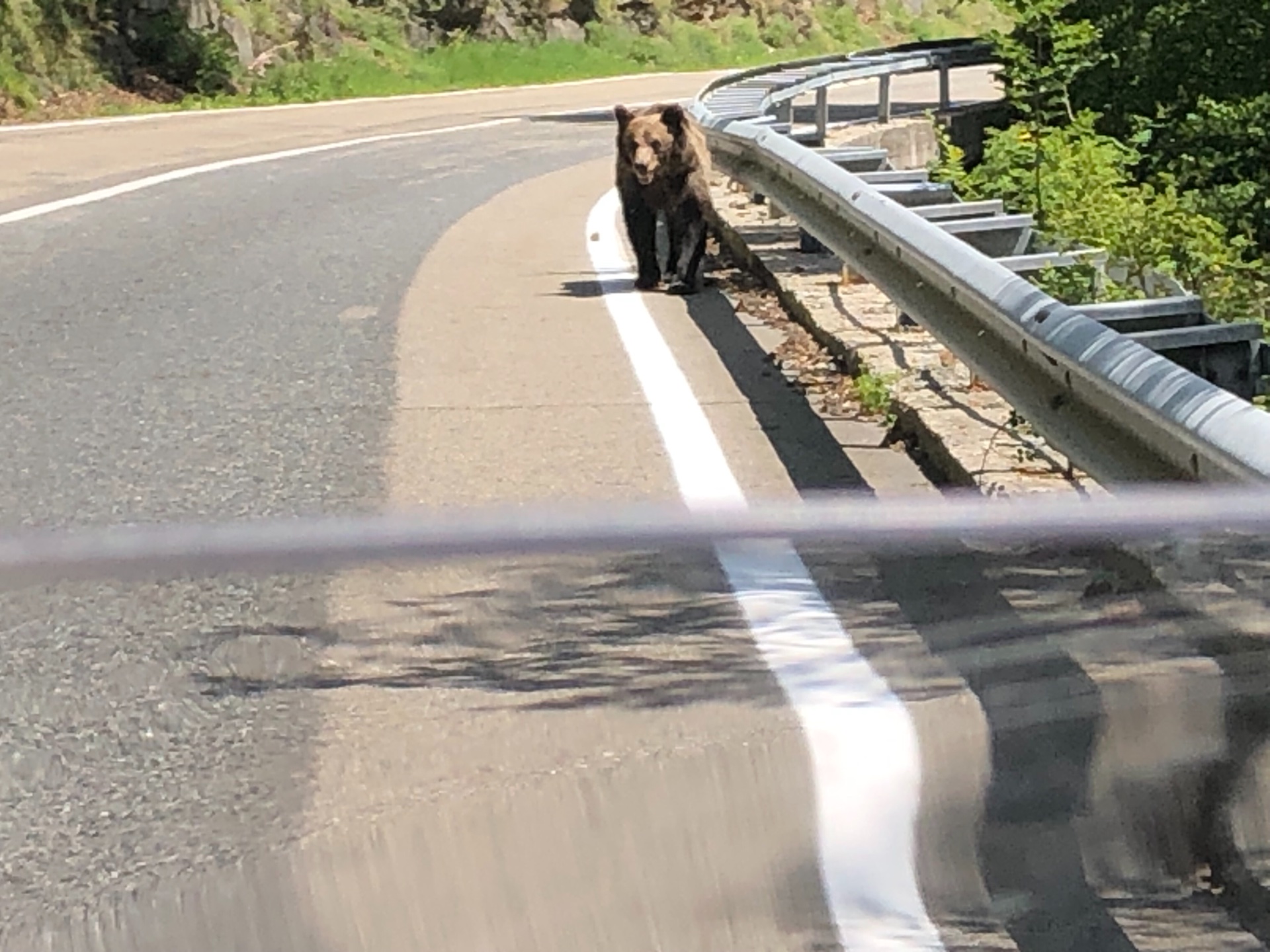 Mir kam eine Horde Rumänien Biker entgegen gefahren und zeigten auf mich, ich hielt an und dachte es sei etwas an der Tenere falsch. Da stand ich also und schaute am Motorrad runter und suchte. Sie hatten alle weiter hinten angehalten und schrien und verwarfen die Hände. Erst jetzt sah ich den Bären auf mich zu trotten. Also Satteltasche öffnen, Handschuhe ausziehen, Handy hervorkramen, entsperren und fotografieren. Die Rumänen hinter mir waren in der Zwischenzeit komplett aussersich. Ruhig wieder alles einpacken und an dem Bären vorbei gefahren.