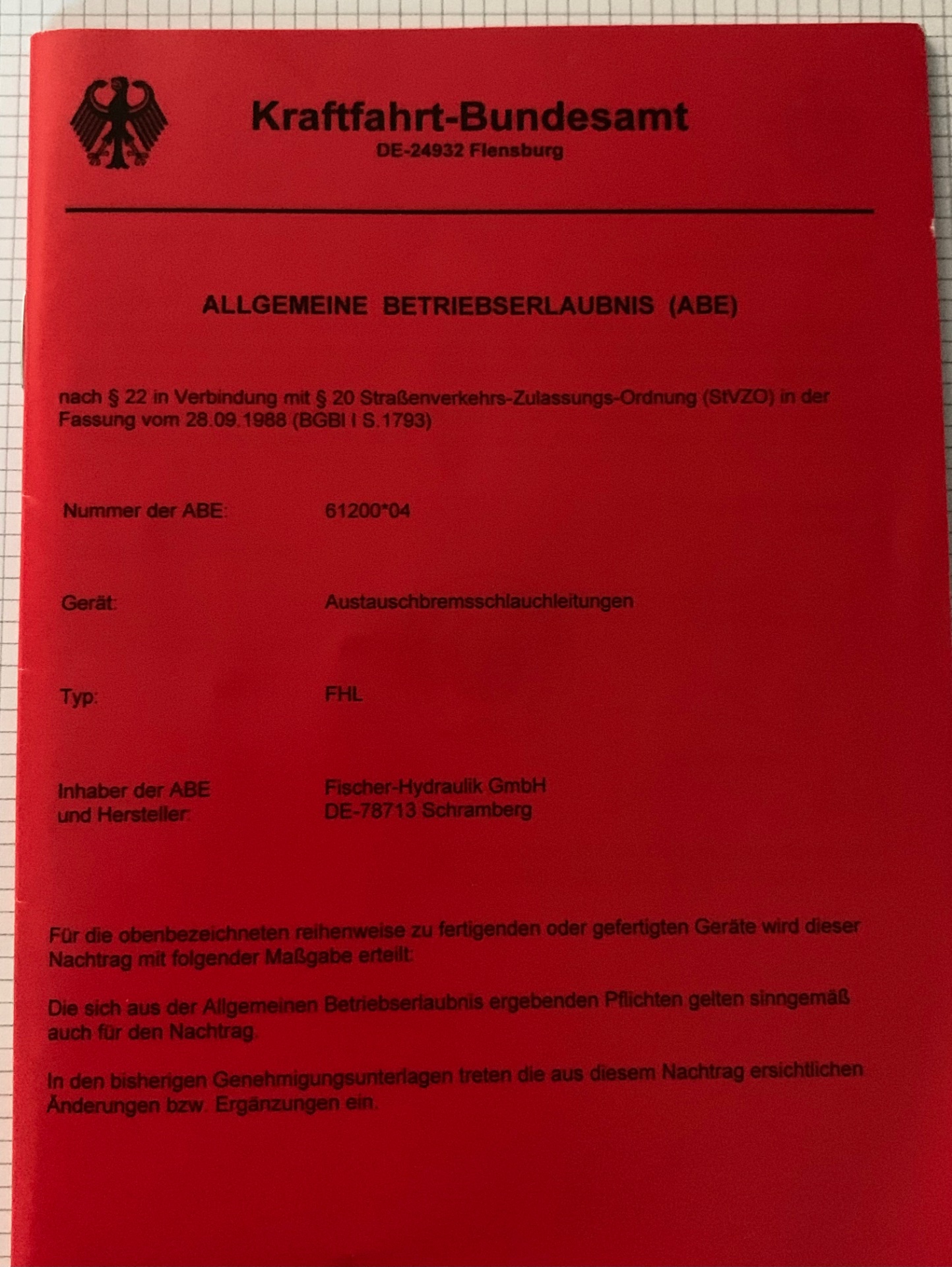 Eine ABE zum nachschlagen, dort sind die Bremsleitungen als Verlängerung und auch als komplett System aufgeführt.