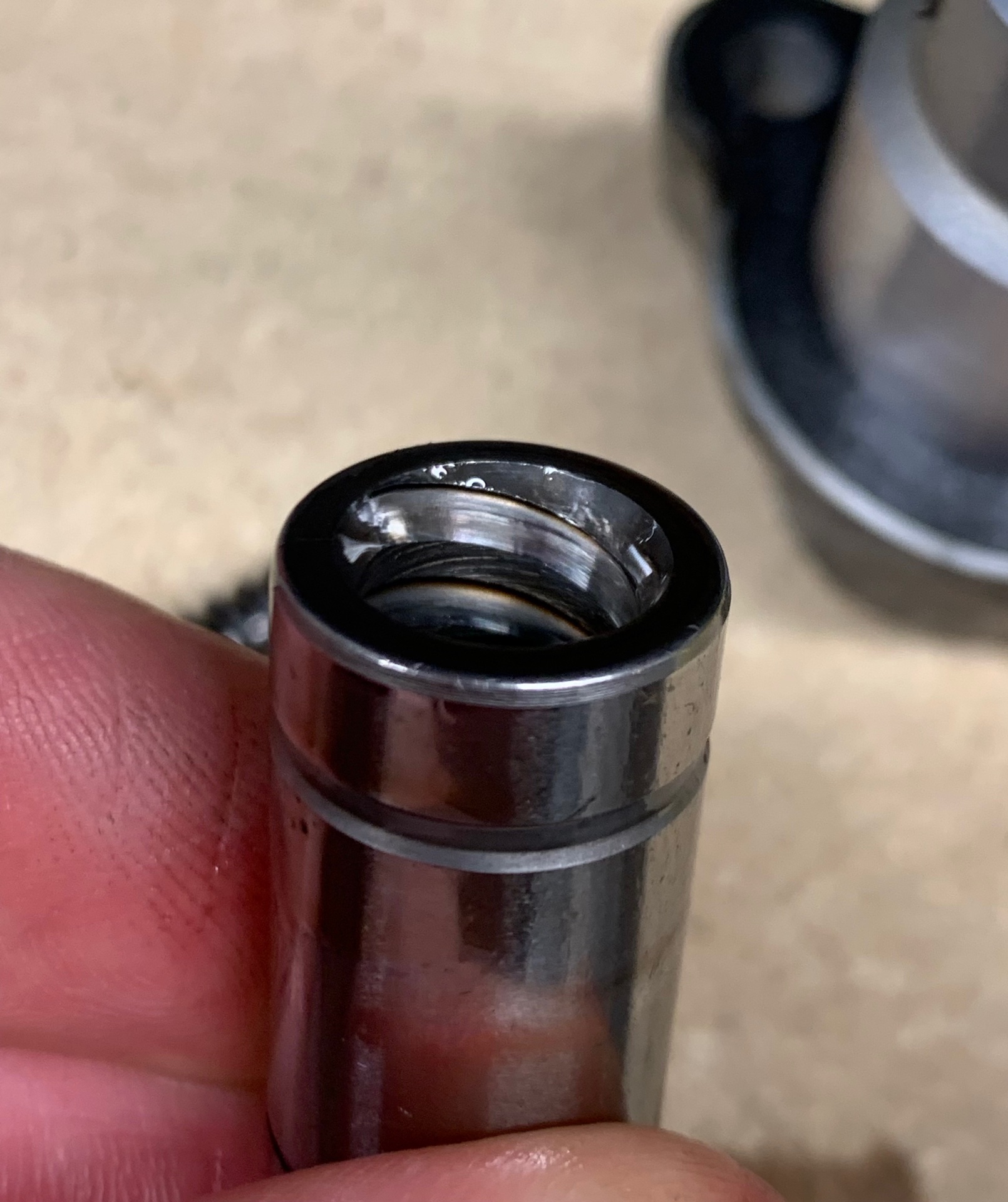 Man sieht schön, wie Yamaha sich das gedacht hat. Hier mit Gewinde gelöst, sodass der Spanner ohne Öldruck nicht mehr zurückfahren kann. Die Feder drückt ihn konstant in Richtung Kette, ein einfaches Zurück gibt's für den Druckbolzen so nicht mehr.