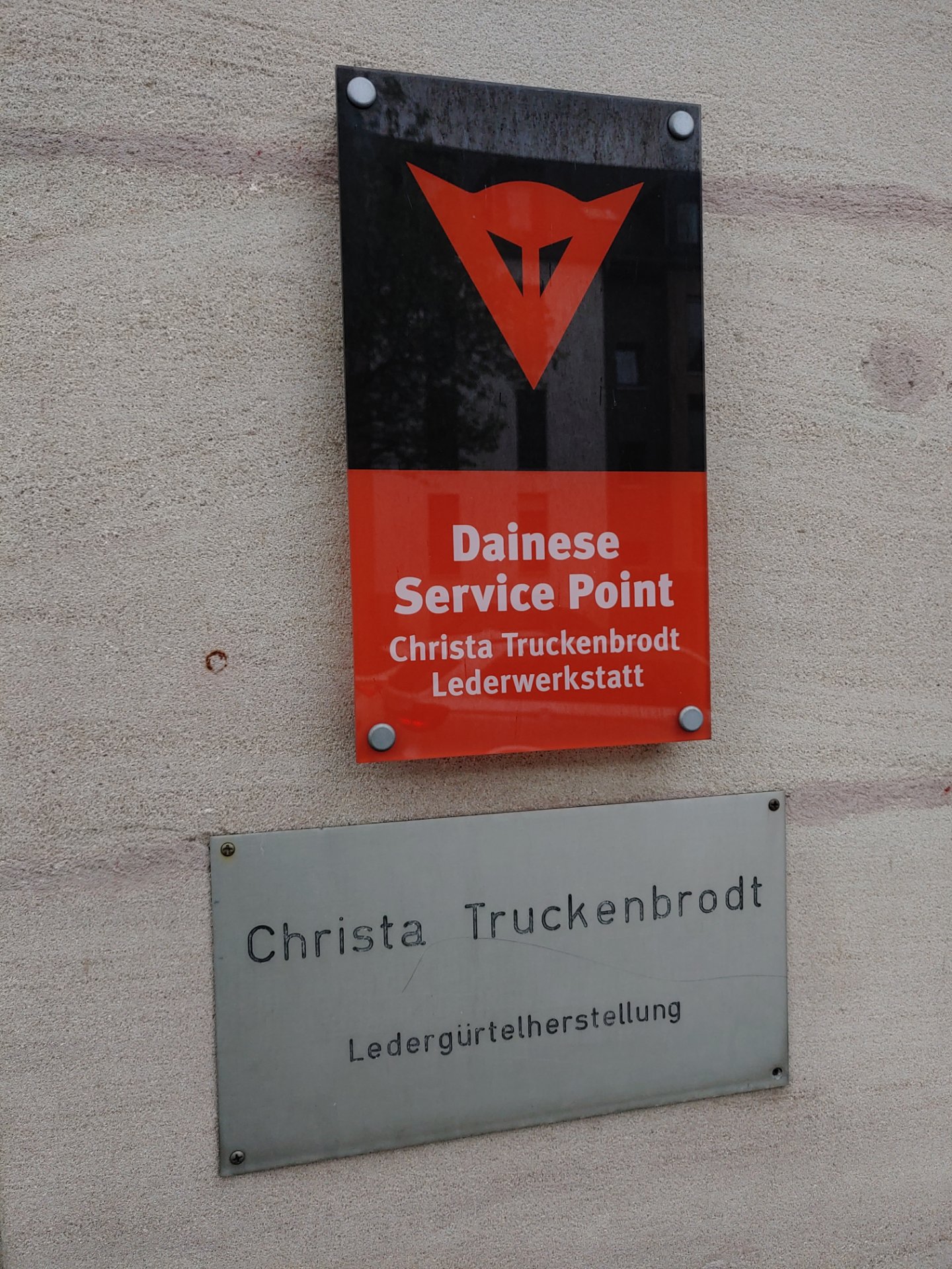 Am Eingang hängt ein Schild "Dainese Service Point".