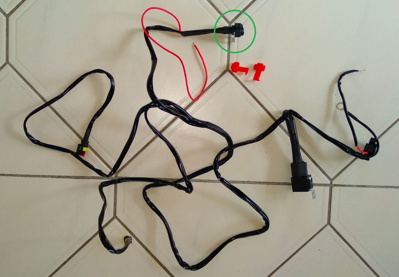 Der mitgelieferte Schalter (grün) am Kabelstrang ist nicht wasserdicht.