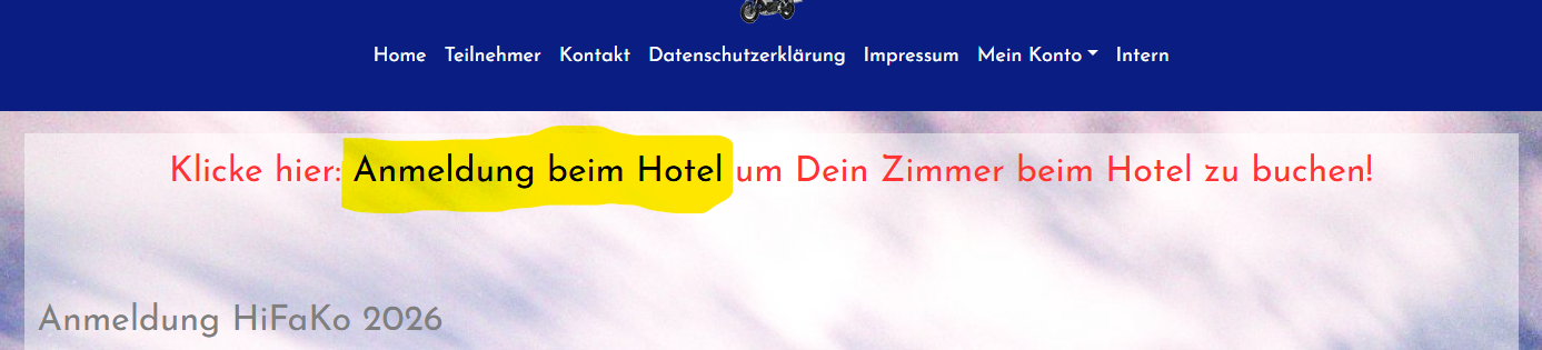 Wenn Ihr Euch dort für das HiFaKo angemeldet habt, erscheint oben auch der Seite der Link für die Anmeldung im Hotel.