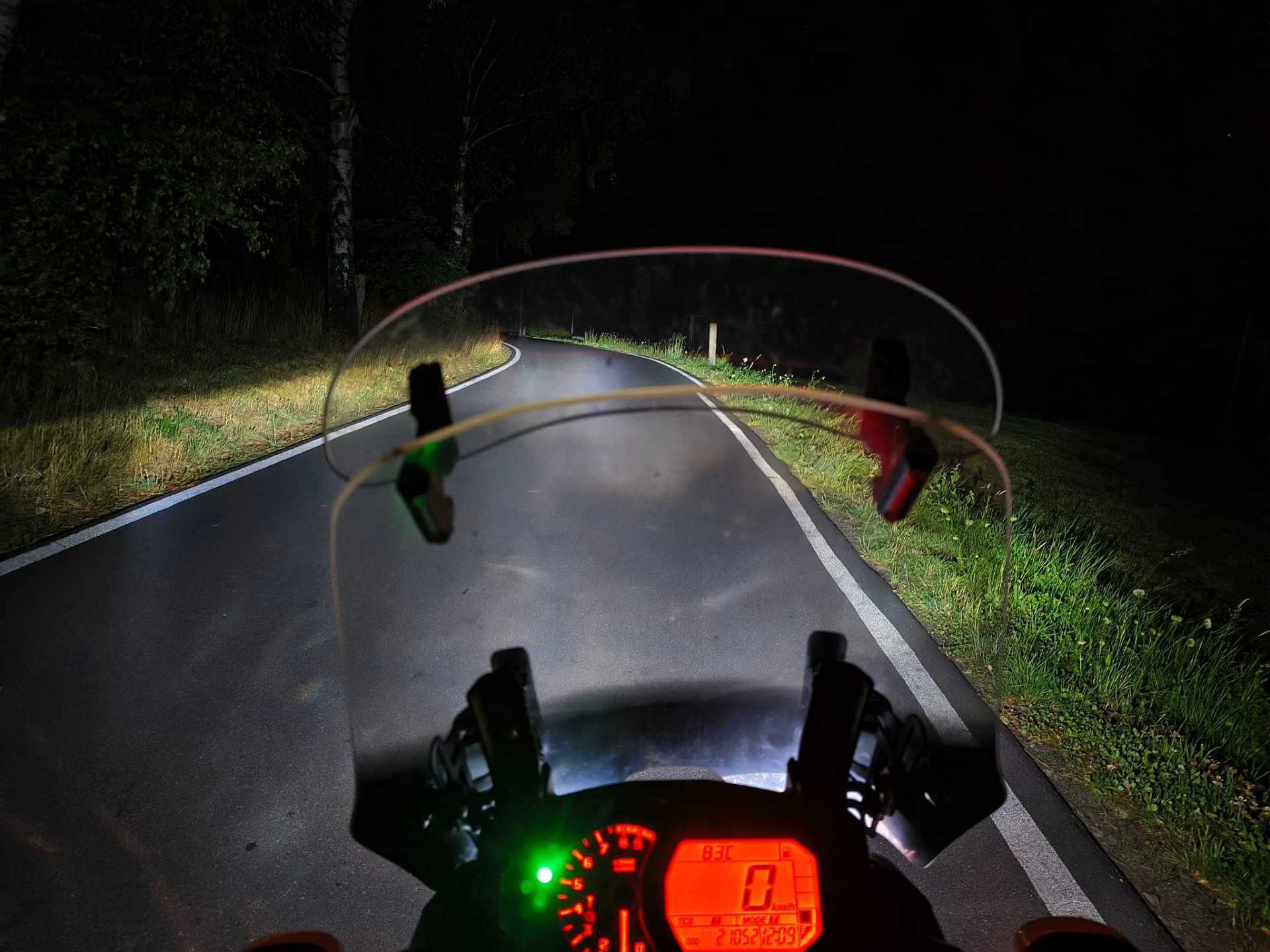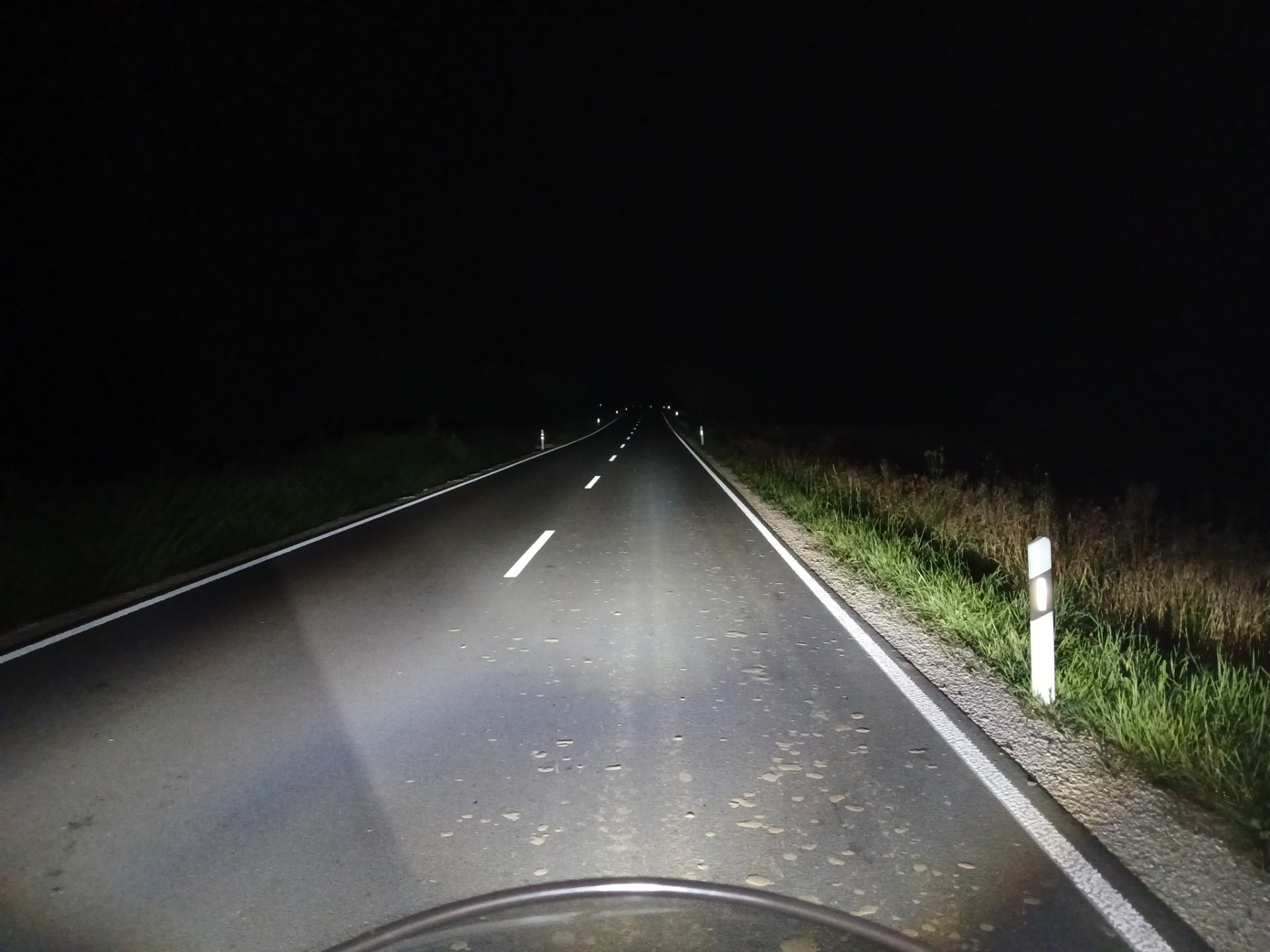 Am Wochenende bin ich jetzt wirklich 1 Stunde bei stockdunkler Nacht unterwegs gewesen. Was soll ich sagen, die Straße war jetzt eindeutig besser beleuchtet als vorher, auch neben der Straße! Klar, Kurvenfahrten/-ausleuchtung sind noch immer schlecht, da ändert das Leuchtmedium wenig. Ich habe mich viel sicherer gefühlt, nachts unterwegs zu sein. Das Fernlicht fand ich jetzt wenig hilfreich direkt vor einem, hat eher alles 1 Stockwerk höher angeballert. Und es war trocken, keine Ahnung wie die Ausleuchtung bei Regen gewesen wäre, Test folgt noch...