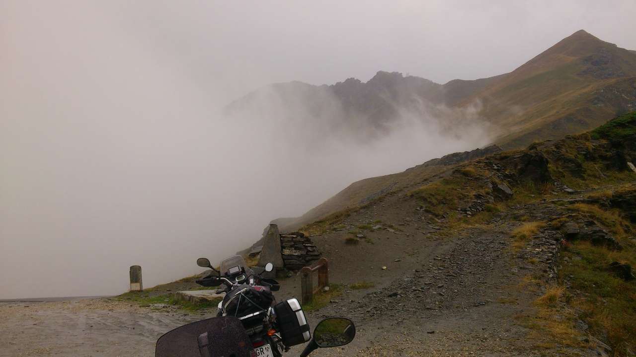 Aber sobald wir von der Autobahn runter waren und zum großen Sankt Bernhard hoch sind spielte das Pendeln keine Rolle mehr. Ein bisschen Eingewöhnung für die Kehren und Serpentinen brauchte ich noch, um mit den Beiden mitzuhalten, aber beim kleinen Sankt Bernhard lief es dann schon richtig flüssig. Die Superdicke Ténéré ist schon ein richtig guter Eckenflitzer! Anschließend gings durch Val d´Isère zum Col de l`Iseran, für mich das erste Mal in Nord-Süd-Richtung. Einfach schönes fahren und mal eine „Abwechslung“ zu meinen bisherigen Alpen-Touren. Anschließend gings in Richtung Col de Mont Cenis. Bei einem kurzen Stopp meinte Mario, er kenne eine schöne Schotterstrecke um den See herum, die wäre ein schöner Einstieg für die Grenzkammstraße. Zwar etwas schwieriger aber an sich auch mit vollem Gepäck gut fahrbar. Warum nicht dachte ich mir und stimmte dem Abstecher zu. Kurz vorm See gings dann rechts runter auf die Piste. Zuerst nur etwas schmaler und gut fahrbar, sogar ein LKW mit einem Bagger auf nem Tieflader kam uns entgegen, Hut ab vor dem Kutscher muß ich sagen! Ein paar Abzweigungen weiter wurde es schon schwieriger, weil leichter Nieselregen einsetzte. Aber der Blick auf den Lac Du Mont Cenis hat mich dafür entschädigt. Aber es kam dicker, die Piste wurde noch schlechter, der Schotter gröber und zu Allem kam auch noch eine störrische Herde Kühe dazu, die den Weg partout nicht mit uns teilen wollte, aber letztlich haben wir uns durchgeschlängelt und weiter gings auf dem immer holprigeren Weg. Dann kamen wir an eine ziemlich steile Steigung…heilige Scheiße… dacht ich noch, als Randsteine lagen grob behauene Steine von gut 1 m Länge, dann eine tiefe ausgewaschene Rinne und der Rest des Belages waren kinderkopfgroße Feldsteine, schön feucht und ziemlich ausgewaschen…aber da düste Mario mit der 1200er schon voraus. Martin mit seiner 660er hinterher. Auf der Hälfte des Anstiegs kippte Martin dann mit seiner Maschine zur Seite. Also erst einmal irgendwie anhalten und ihm helfen. Zum Glück ist ihm nichts passiert und es gab nur ein paar Kratzer an den Koffern. Die Rinne war gute 20 cm tief, vermutlich ist er aufgesessen und dann war die Traktion futsch oder so. Also das Mopped aufrichten, gemeinsam in die Spur setzen und dann wieder losfahren. Das ging dann auch gut und Martin kam heil oben an.