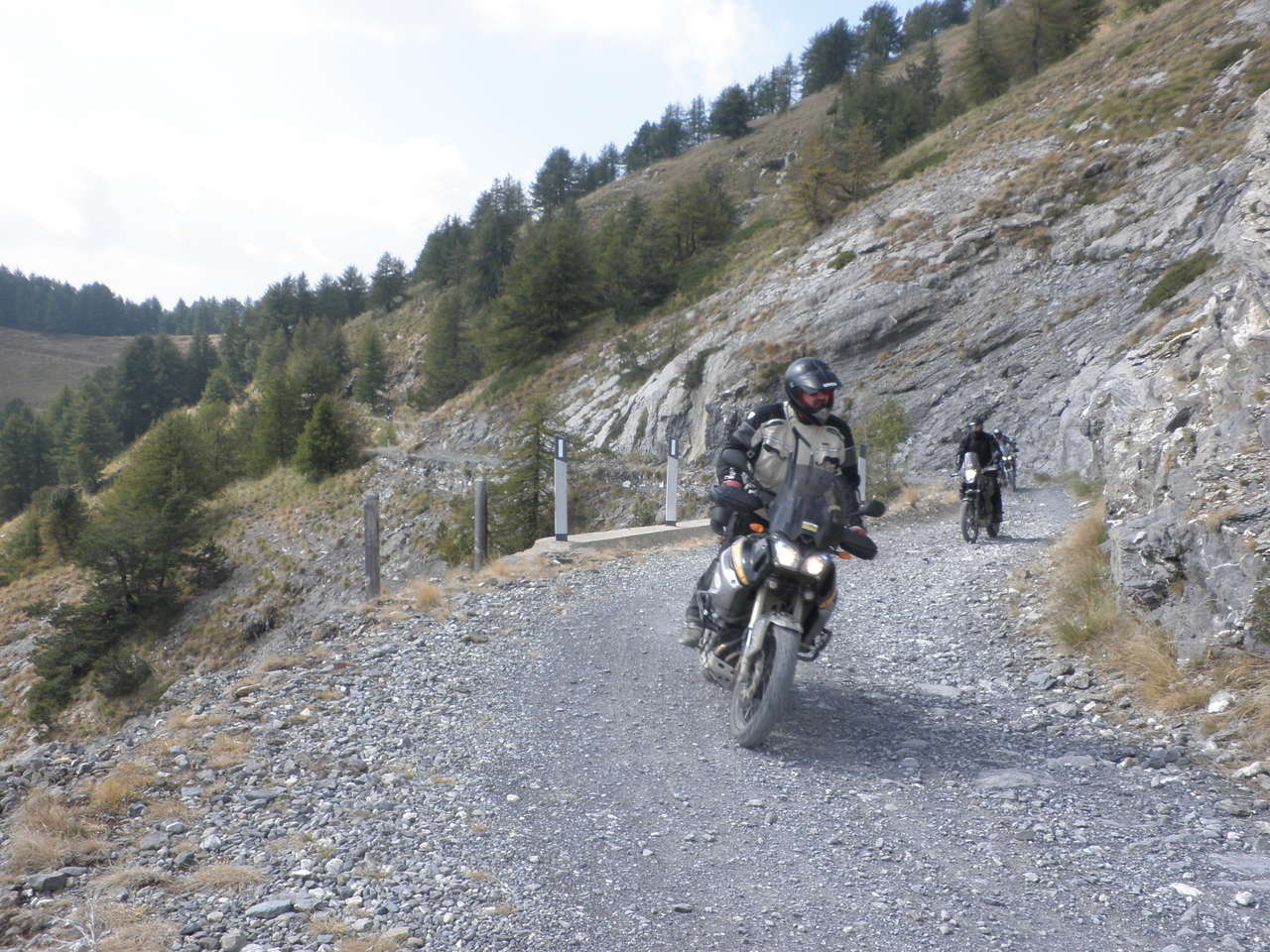 Auch diese Passage ging vorbei und als Belohnung gab es dann eine wunderbare Aussicht aufs Refugio Barbera und die noch bis dahin zu fahrende Strecke. Teilweise auf mehreren hundert Metern sozusagen aus dem Fels gesprengt führte die Straße am Hang entlang zum Col des Seigneurs. Von dann führt ein Weg hinunter zum Refugio Barbera, wo wir die Mittagspause einlegten und auf die anderen warten wollten. Von hier aus sind es noch gut 10 km bis zum Boaire und der berühmten Felsnadel. Das Mittagessen war wie gewohnt lecker dazu dann den obligaten Espresso. Knapp eine Stunde nach und trafen dann die Kumpels ein. Mario hat anscheinend einen neuen Rekord aufgestellt, er ist die Strecke nach Triora und zurück in ungefähr der Zeit gefahren, die wir nur für die Hinfahrt gebraucht haben… eben Super-Mario! Und es zeigt, welches Potenzial in der 1200er ST steckt.