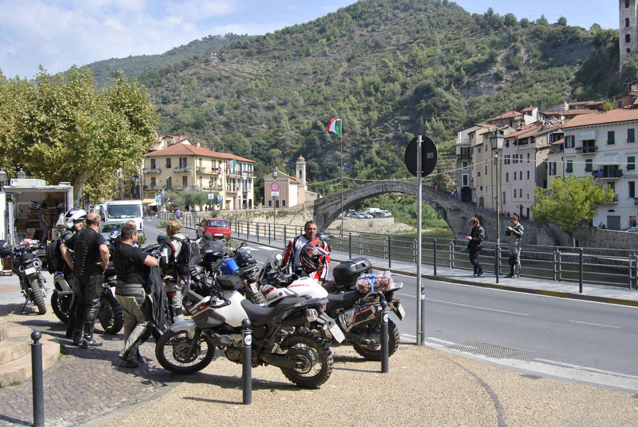Nach dem Boaire gings dann relativ zügig weiter zum Col du Tende, wo wir dann auf die beiden Martins trafen. Im Refugio auf der Passhöhe gabs dann noch eine verdiente Pause und dann sind wir am Tende und am Fort de la Marguerie vorbei eine teilweise auch heftige Piste gefahren, die sich nachher mit vielen engen Kehren als Chemin de Spegi hinab ins Tal nach Tende gewunden hat. An der Tankstelle wurde noch einmal nachgetankt. Für mich war das auch der Punkt, wo ich keinen Schotter mehr haben wollte. Die Abfahrt hat mich ziemlich Kraft gekostet und für den geplanten Weg über den Col Linaire nach Triora Strecke fehlte einfach Kondition und bevor ich auf dem Pass das Mopped hinschmeiße wollte ich lieber die längere Strecke über Ventimiglia fahren, sprich nur Asphalt. Zusammen mit Mario sind wir dann diese Strecke gefahren, eine super ausgebaute Strecke bis Ventimiglia, die auf Grund der herrlich zu fahrenden Kurven noch einmal Adrenalin freisetzte und reichlich Spaß machte. Dann Stadtverkehr in Ventimiglia und zum ersten Mal erlebte ich die wahrhaft im Kamikaze-Stil fahrenden italienischen Rollerfahrerinnen und Fahrer. Himmel, die sind echt gnadenlos, aber die Autofahrer machen einfach Platz und so kommt Jeder gut voran. Eigentlich ein gutes Beispiel für Leben und leben lassen im Straßenverkehr. Schade nur, dass sowas in Deutschland nicht klappen wird… Von Ventimiglia ging es dann über viele Kurven und ein paar kleinere Pässe zurück nach Triora, wo wir so gegen 20:00 Uhr eintrafen. Zum Glück stand das obligatorische Bier schnell vor mir und es hat herrlich gezischt, als ich die ersten Schlucke trank.