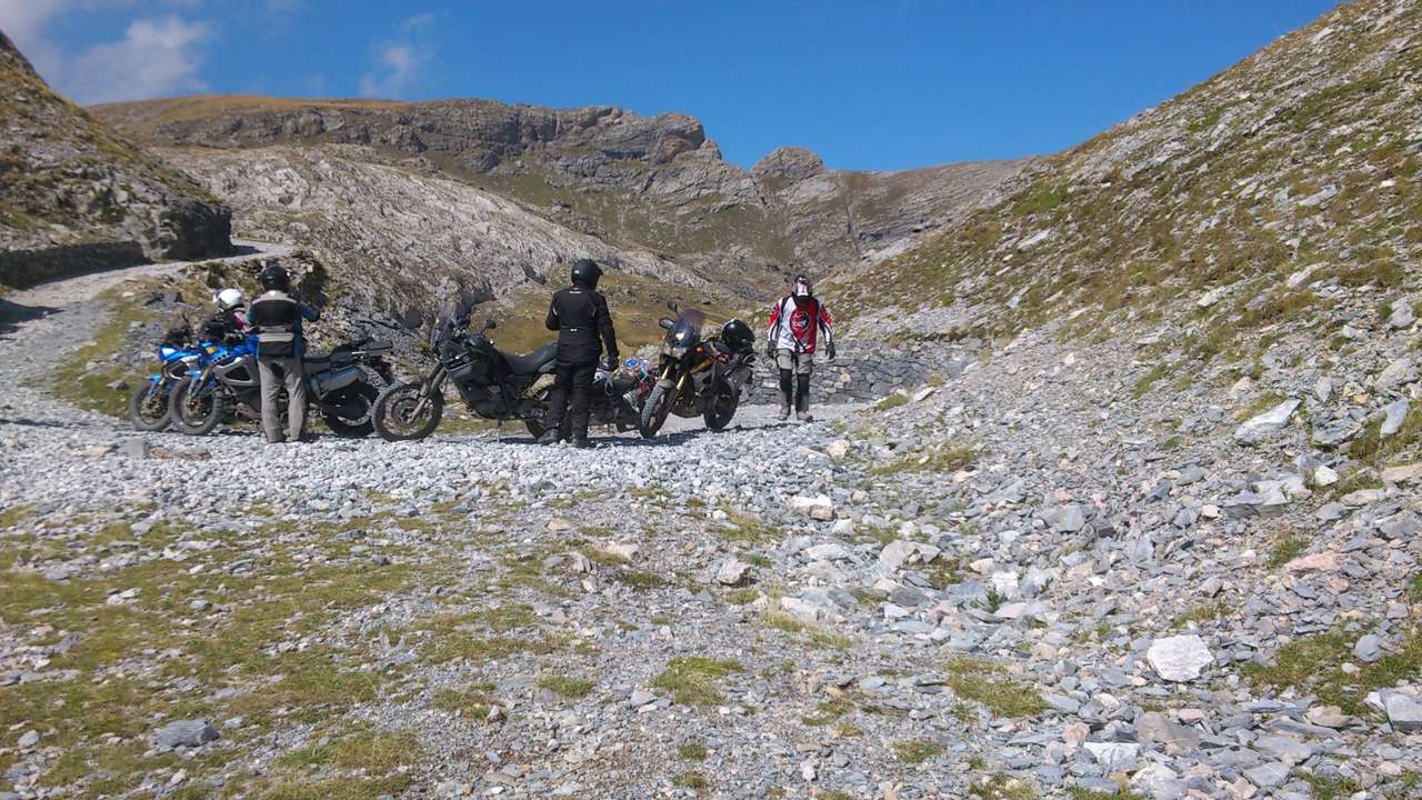 Auch diese Passage ging vorbei und als Belohnung gab es dann eine wunderbare Aussicht aufs Refugio Barbera und die noch bis dahin zu fahrende Strecke. Teilweise auf mehreren hundert Metern sozusagen aus dem Fels gesprengt führte die Straße am Hang entlang zum Col des Seigneurs. Von dann führt ein Weg hinunter zum Refugio Barbera, wo wir die Mittagspause einlegten und auf die anderen warten wollten. Von hier aus sind es noch gut 10 km bis zum Boaire und der berühmten Felsnadel. Das Mittagessen war wie gewohnt lecker dazu dann den obligaten Espresso. Knapp eine Stunde nach und trafen dann die Kumpels ein. Mario hat anscheinend einen neuen Rekord aufgestellt, er ist die Strecke nach Triora und zurück in ungefähr der Zeit gefahren, die wir nur für die Hinfahrt gebraucht haben… eben Super-Mario! Und es zeigt, welches Potenzial in der 1200er ST steckt.