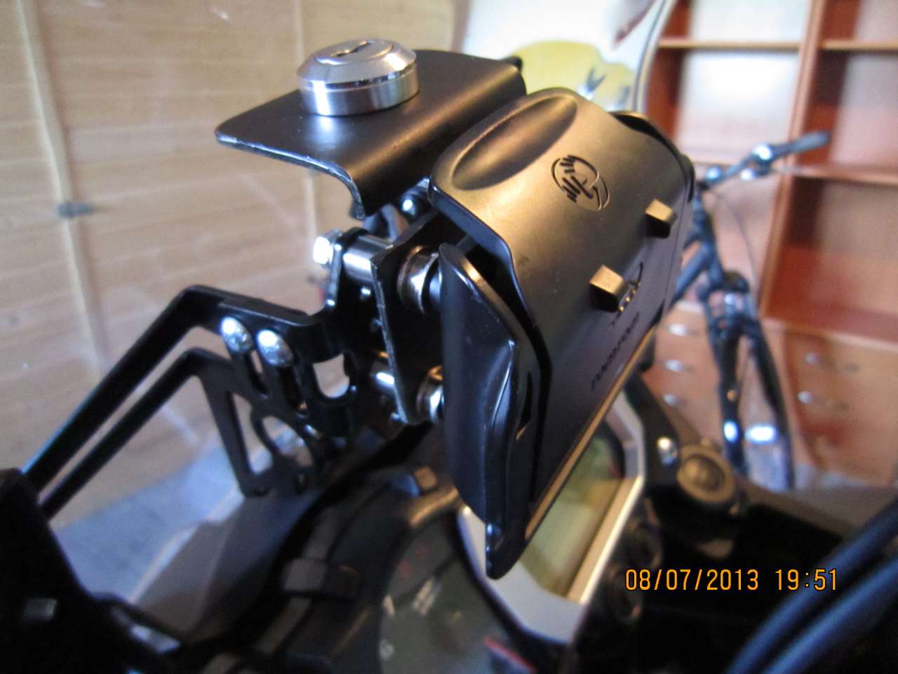 Habe mein Rider so montiert,wie ich es auf den Fotos zu sehen ist.Normalerweiser kann das Rider problemlos aus der Halterung genommen werden,habe die aber nun so umgebaut,das es den Dieben nicht mehr so leicht fällt.Materialkosten für den Umbau,belaufen sich bei ca. 10 €.Die Arbeit sollte man nicht rechnen.Ist ne große Fummelei,hat aber doch noch geklappt.Habe nur V2A verarbeitet,ob Schrauben,oder das Blech.Das Briefkastenschloss kommt von Amazon.Der Haupthalter ist von Wunderlich.Die lange Distanzhülse auf dem Foto,hat den Zweck,das man mit dem Schloss nicht so eng an der Scheiben anliegt.Die kurze Hülse mit den Scheiben rechts und links der Buchse,muss zwichen dem Schlossblech und dem Halter sitzen,damit man das Tom Tom entriegeln und abnehmen kann.Sind die Buchse und U-Scheiben icht dazwischen,kann der Hebel an der Navihalterung NICHT herunter gedrückt werden.