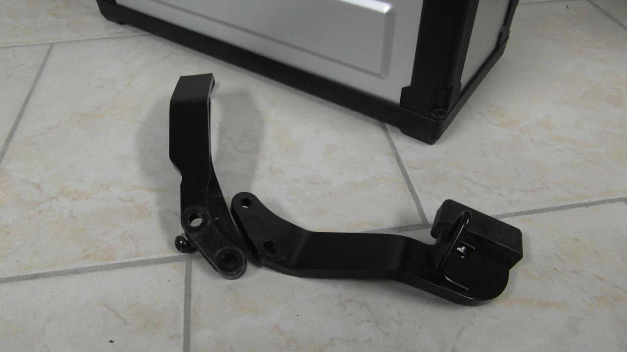 Hinter dem linken Fussrastenträger ist eine Stahlverstrebung eingebaut (auf den Bildern das Teil links, das rechts sichtbare Teil ist der Knödel, in den der Koffer eingeklinkt wird, also ein Teil des Kofferträgers).