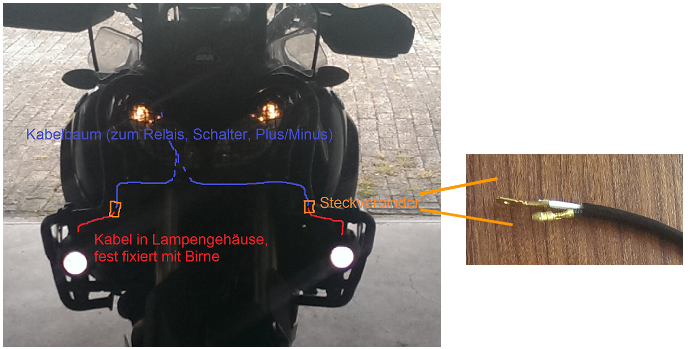 Vom Kabelbaum (mit der ganzen Mimik wie Relais, Sicherung, Plus/Minus, Schalter = blau) gehen zwei Kabelstränge mit jeweils Plus und Minus in Richtung der Scheinwerfer ab. Diese werden von den Anschlußkabeln der Scheinwerfer (rot), die ca. 15 cm aus dem Scheinwerfergehäuse rausgehen, steckbar mit einem Rundstecker (Masse?) und Flachstecker (Plus?) verbunden (orange). Am Ende kommt ein Schrumpfschlauch drum. Soweit alles gut.