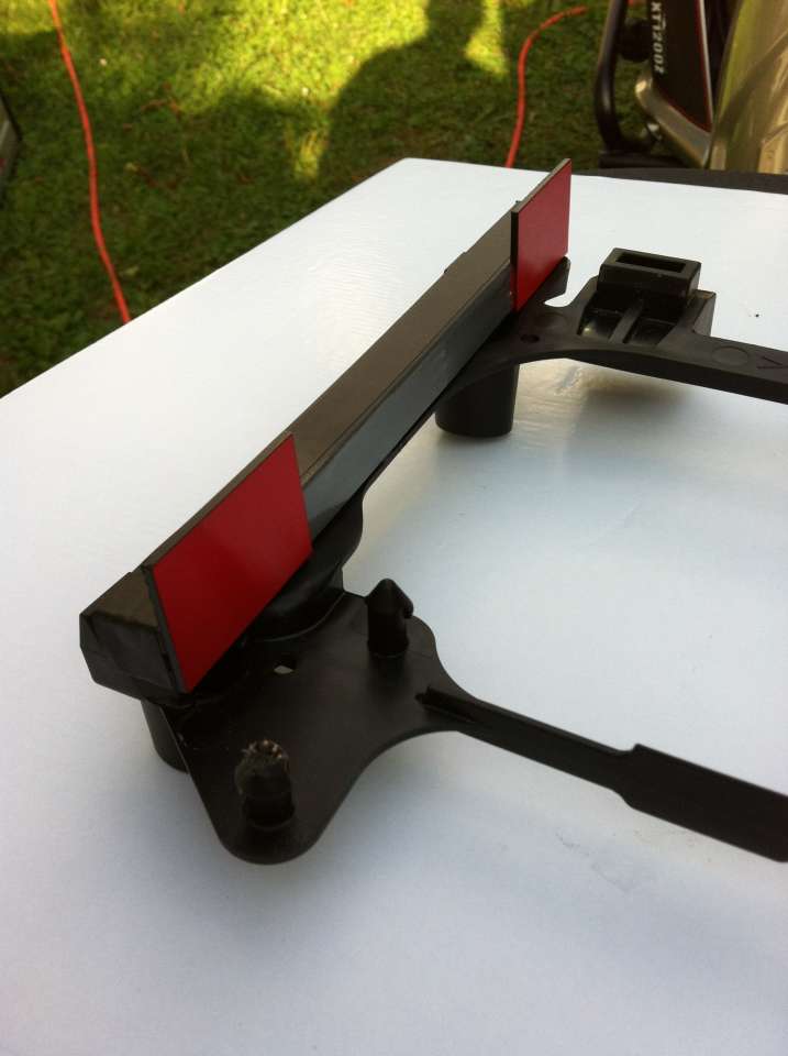Seitlich helfen auch Fischertechnik-Elemente (rot im Bild) den Rahmen später auf dem Heck zu zentrieren, da die eigentlichen Pins nun in der Luft hängen. Die beiden so entstandenen Distanzstücke habe ich passgenau mit Heißkleber unter den Hilfrahmen geklebt. Der Verschlusshaken an der Sitzbank musste ebenfalls um 1,5 cm verlängert werden, damit er anschließend wieder ins Schloss passte. Hier ein Bild meiner feinwerklichen Meisterleistung, die so gut schließt, wie das Orignial. Für die hintere Aufnahme der Sitzbank (weiße Kunststoffnase) musste ein Profilstück der vorhandenen Fassung nachempfunden werden und im Abstand von 1,5 cm ob auf die vorhandene Aufnahme montiert werden. Wie man sieht, hält auch hier das Provisorium sehr ordentlich: zwei dicke Kabelbinder tun ihren Dienst