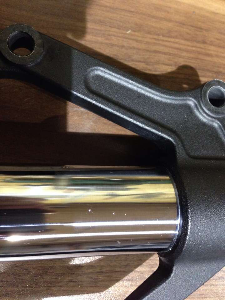 Habe heute meine Gabel ausgebaut weil sie mehrere kleine Abplatzer der Beschichtung hat. Dies beidseitig.Auf dem Bild leider nur als Punkte zu erkennen.