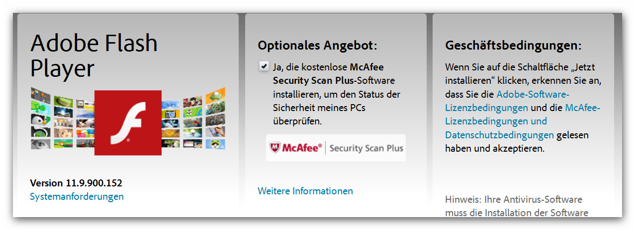 vorsicht beim Update von Adobe Flash Player unter Windows: Standardmäßig wird jetzt wohl ungefragt so eine McAfee-Crapware mitinstalliert, ohne dass man das abwählen kann. Die "Erweiterte/Fortgeschrittene" Installation, bei der das bisher möglich war, wird jetzt anscheinend gar nicht mehr angeboten.