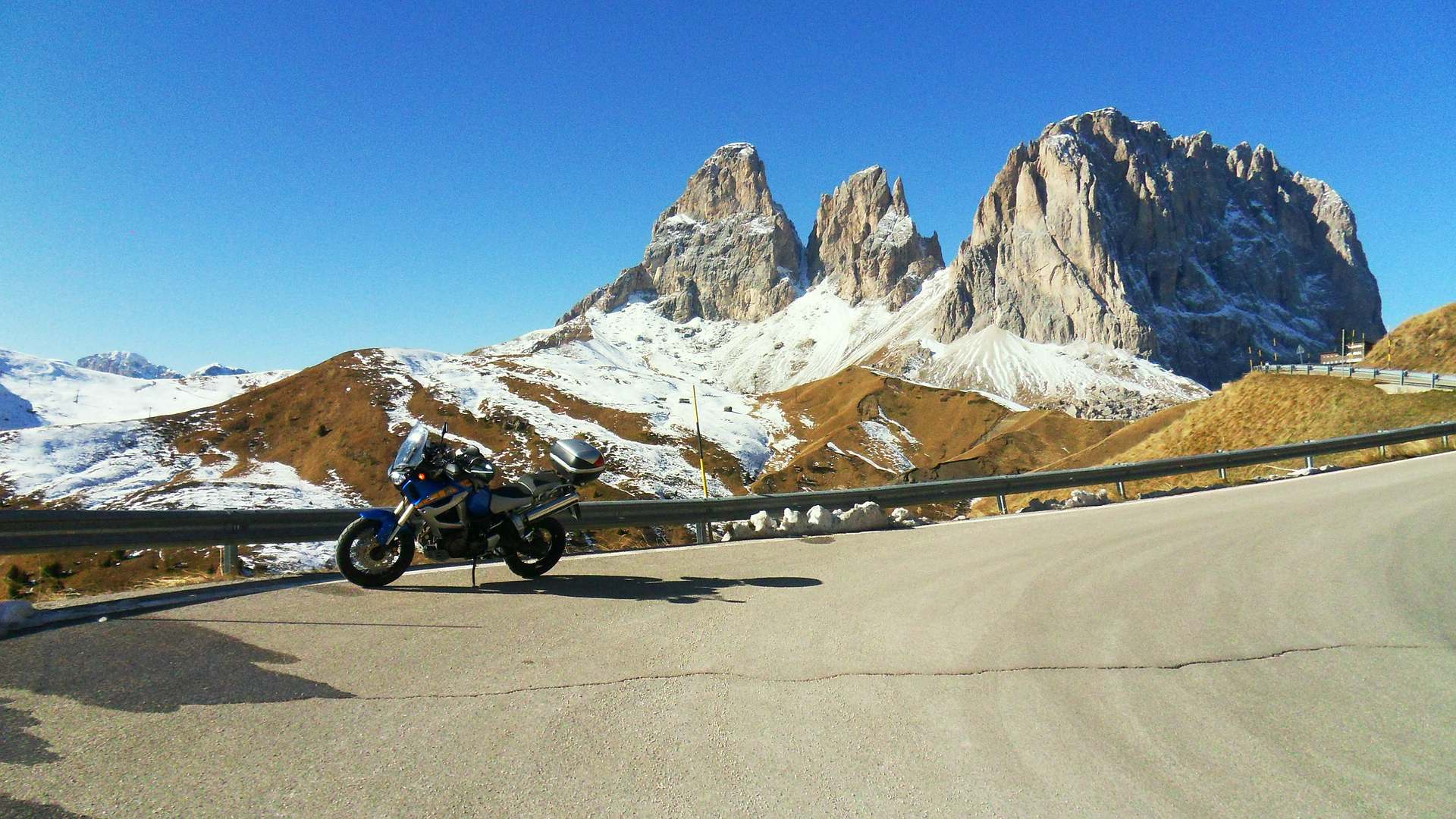 Also rauf zum Sellajoch für das Wetter sehr wenig Verkehr und auf der gerammten Tour so gut wie keine Biker?? ( schon Winterschlaf ) und nur 2 Busse. Überall noch n paar Bilder geknipst ( Hält aber ungemein auf ). Oben am Selle noch 13°. Dann weiter zum Pordoi mit seinen Berüchtigten Kurven und Kehren ein genuß und der knackig blaue Himmel dazu so macht das fahren Spaß aber gerade am Pordoi sind auf der Schatten Seite doch viele glatte stellen vom Schmelz Wasser des über die Straße läuft an Arabba vorbei weiter zum eher beschaulichen Campolongo mit schönen geschwungenen Kurven. Dort fand ich auch eine Hütte bisschen abseits zum Brotzeit machen. Auf hartem rutschigem Boden mit feuchtem Gras na ja ging grad so. Weiter nach Corvara di Badia dort fängt das Grödenerjoch an das sein Ende auf der selben Stelle hatt wo das Sellajoch anfängt. Kurven mäßig fange ich lieber mit dem Sellejoch an. Aber auch die An und Abfahrt auf der SS242 hat es in sich mit vielen Kurven. So dann in Sterzing noch schnell mal zu Penserjoch und Jaufenpass geschaut beide offen. Schwup übern Brenner , Innsbruck, Zirllerberg , nach dem Garmischer Tunnel dann der 1ste Stau 2 spurig bis nach Oberau dann 1 spurig bis zu Autobahn nach München. Möcht nicht wissen wies am Ende in München aus geschaut hat. Aber ich bin ja in Oberau links noch Oberammergau und dann Heim auf fast leeren Straßen.