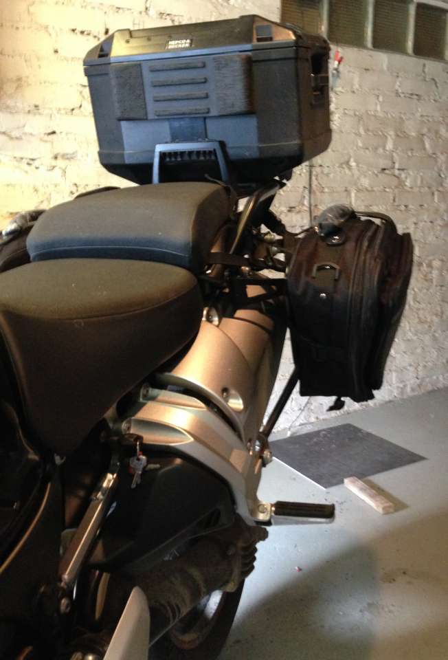 Die Satteltaschen können zwar relativ schnell mit Kunstoffschnellverbindern angeklippst werden, dennoch muss man noch 1 oder 2 Sicherungsgurte dranmachen. wenn ich o.g. Variante nehme, könnten die Satteltaschen einfach über Nacht am Mopped bleiben und ich könnte die Schnellverbinder noch zusätzlich mit Kabelbindern o.ä. sichern.