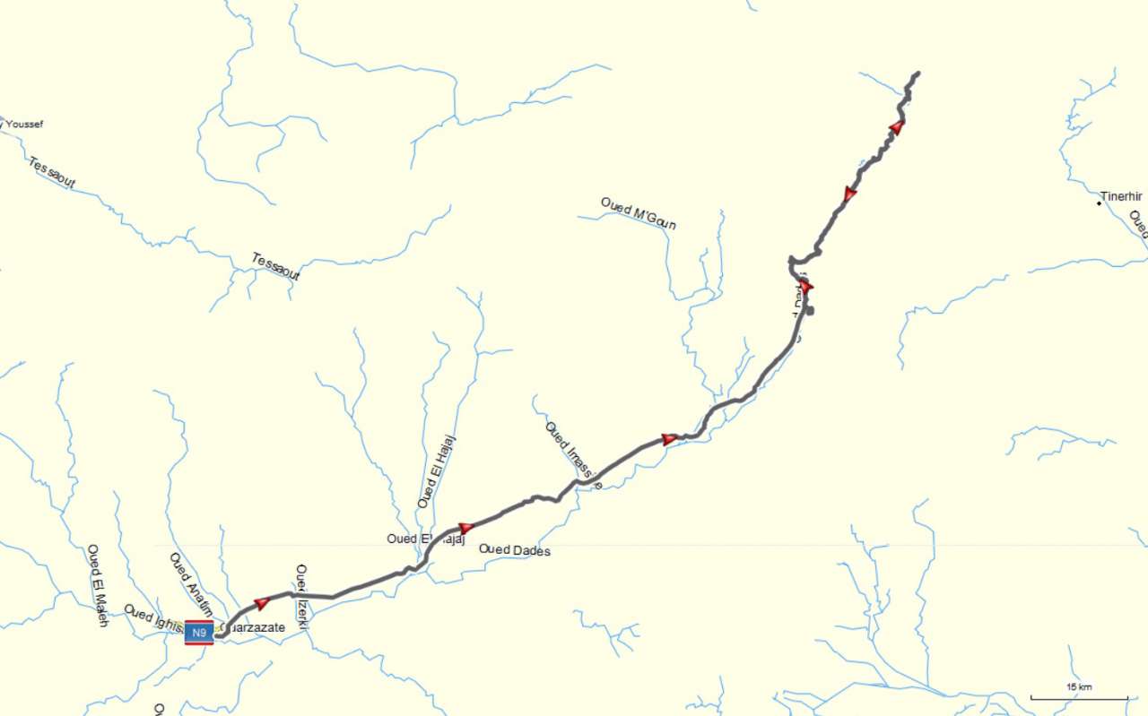 War die Schlucht am Anfang noch eng und mit steilen Felswänden umgeben, wurde sie im weiteren Verlauf immer weiter und ging in eine Hochebene über. Es gab kam Orte und auf den 155 km bis Goulmima begegneten uns gerade mal 10 Autos. Lag die Todra-Schlucht noch auf 1.500m stiegt die Straße über die Hochebene auf 2.000m. Im weiteren Verlauf durchfuhren die Rheris-Schlucht und den Gorges de l’Amsed. Nach 180km herrlichem Umweg waren wir wieder auf der geplanten Route über die N10.