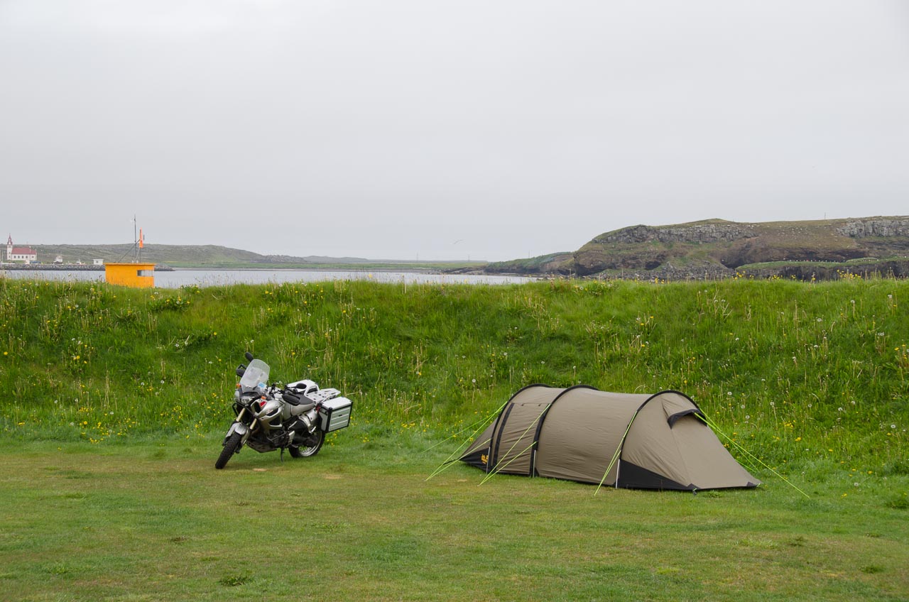 Außerdem kriecht jetzt doch die Kälte des Fahrtwindes durch alle Kleidungsschichten. Als letzte Option habe ich noch Wollunterwäsche im Gepäck – ich kann nur hoffen, dass diese genug Wärmeschutz bietet oder die Temperaturen im Laufe des Trips ansteigen. Einstellig bei Wind und ständigem Nieselregen ist jedenfalls nicht optimal. Wie auch immer, müde und unterkühlt laufe ich schließlich in Raufarhöfn ein. Am Campingplatzschild fahre ich erstmal vorbei – in der Hoffnung, dass es ein Hinweis auf einen „richtigen“ Campingplatz weiter hinten ist, statt nur für die kleine, runde Wiese hinter der Grundschule. Am Ortsende sehe ich ein, dass dem nicht so ist, kehre zu der Wiese zurück, stelle mein Zelt auf und lege mich erstmal hin.