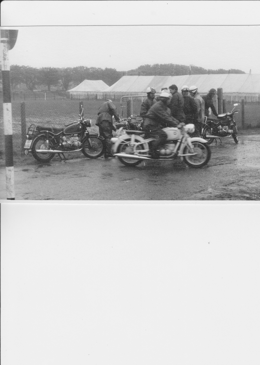 Das Bild von der Isle of Man, die ganz zwangsläufig im gleichen Jahr mein Ziel war, zeigt, daß die Schwingen-BMWs zu der Zeit doch "in" waren, und da steht meine garnicht dabei. Links das ist eine R60. Man beachte das englische Wetter, das in dem Jahr dort die Szene beherrschte.