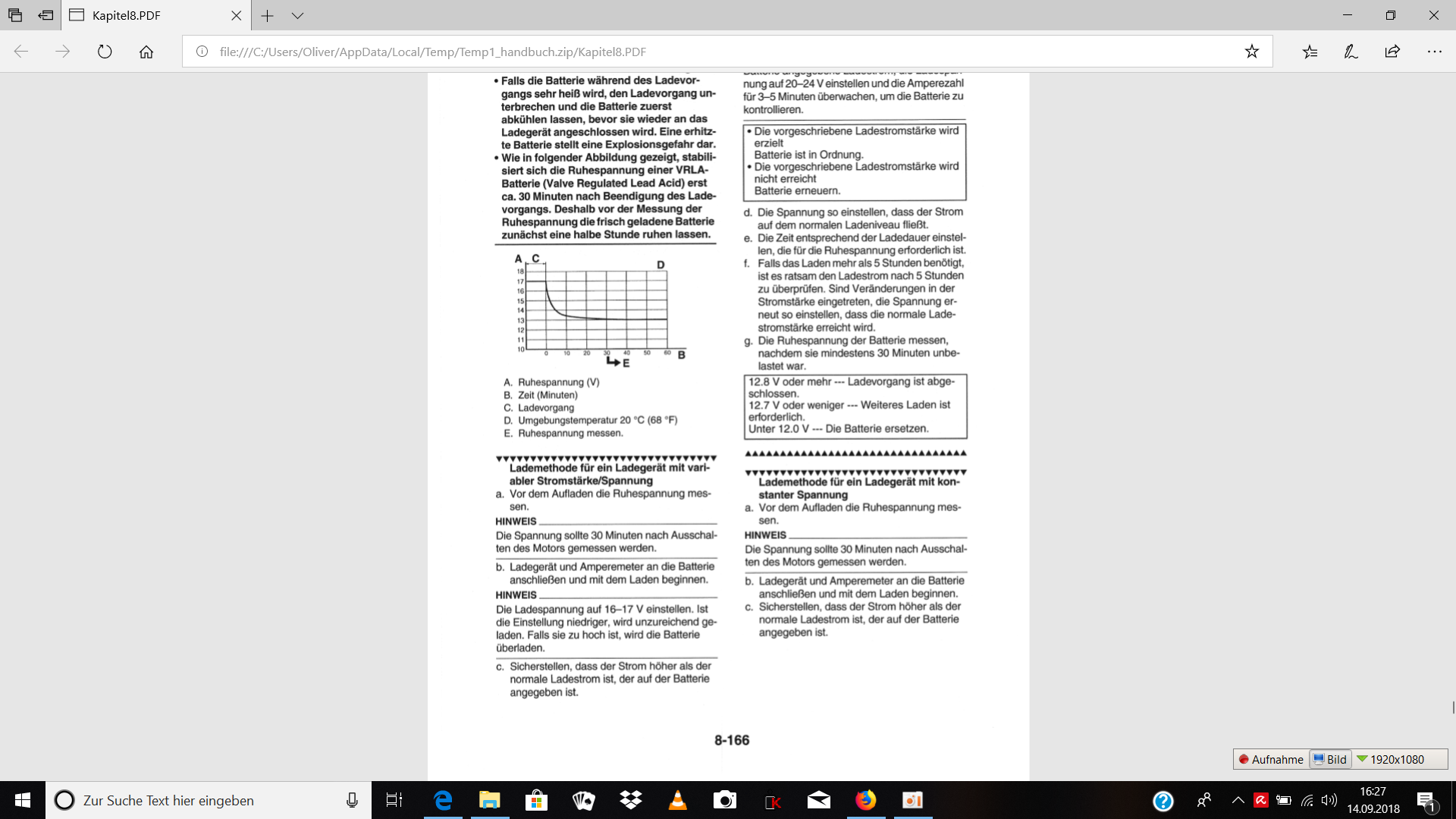 1.Mess die Batteriespannung bei eingebauter Batterie an den Klemmen sollte 12,5 -12,7 V betragen bei beruhigter Batterei d.h. min. 3h sollte keine Ladung erfolgt sein. Wenn niedriger, ans Ladegerät hängen und mal ausreichend lange laden lassen. Aber Achtung - die Leerlaufspannung sagt nicht alles. Eine Batterei kann hochohmig werden, sie läßt sich noch auf die Ladeschlussspannung aufladen, bricht aber bei Belastung spannungsmäßig zusammen.
