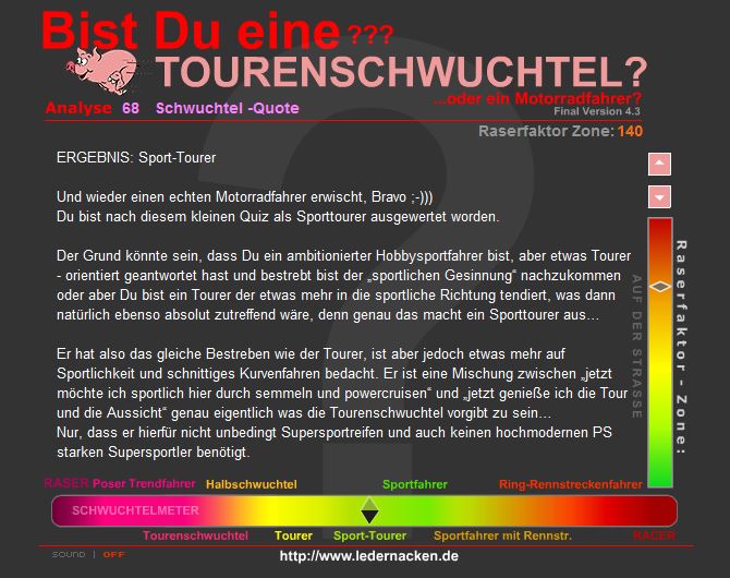 Ergebnis: Tourer, Schwuchtel-Quote 95, Raserfaktor 104