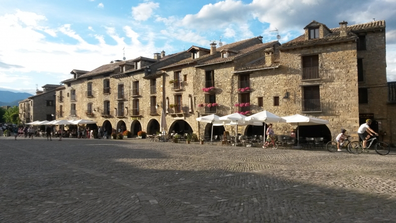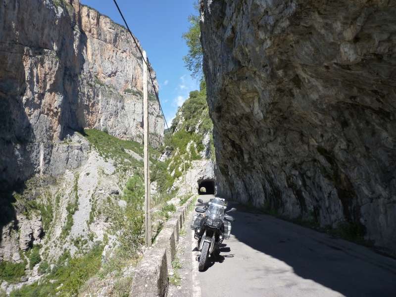 In Castejon de Sos bei einem späten Mittagshäppchen dann das nächste Trennungsgespräch. Ich würde gerne die Pista von Chia nach Plan fahren. Aber wo sollten wir uns wieder treffen, da die Übernachtung noch nicht geklärt war? In Ainsa wurde ein Hotel ausgemacht und somit stand ein Plan: Angie fährt per Navi die N-260 zum Hotel, ich nehme die geplante Offroad-Route und komme dann nach. Gesagt - getan. So bin ich wieder einmal durch die beeindruckende Bergweld der Pyrenäen auf feinstem Schotter (streckenweise im wahrsten Sinne des Wortes) gegurkt.