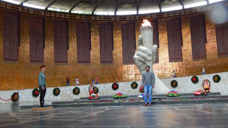Auf meinen Wunsch sind wir dann dort hin gelaufen und den Berg bis zur Statue Mat Rodina hoch. Ich muss schon sagen, dieses monumentale Denkmal hat mich sehr beeindruckt, zumal ich die Geschichte vom Kampf um Stalingrad ziemlich gut kenne. Besonders die Ehrenhalle mit den Tafeln der Gefallenen, der ewigen Flamme und den dort stehenden Ehrenposten war zutiefst beeindruckend.
