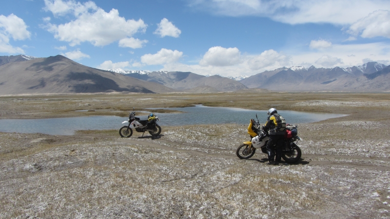 Naja, später haben wir diese Stelle nicht gefunden, weil es einfach zu viele solcher Stellen gab. Dann kamen so viele spektakuläre Streckenstücke, das man sie gar nicht alle beschreiben kann, man muss es selber erfahren haben im wahrsten Sinne des Wortes! Und dann kam der Pass, ein wirklich spektakuläres Stück Trasse, steil, enge Serpentinen, in denen Bäche zu queren waren, steile Anstiege wie ich sie noch nie erlebt habe, und es zog sich hin, die Fahrbahn oft nur 2 m breit, zur Hangseite abgeschrägt und dazu ein spektakulärer Blick über den Pamir und ins nachher ziemlich weit unten liegende Tal. Einfach atemberaubend, allerdings blieb nicht viel Zeit fürs gucken, der Weg musste im Auge behalten werden. Gut das wir relativ leichte und geländegängige Enduros haben, die sich oft nur im 1. Gang den Berg hinauf kämpften. Dann ging es hinab, der Abstieg schien endlos und ich hatte das Vergnügen, das Mopped noch einmal kontrolliert in einer Serpentine abzulegen, konnte aber diesmal mit eigener Kraft Mensch und Maschine aufrichten. Beschreiben läßt sich der Abstieg nicht wirklich mit Worten, auch steil ist hier relativ, ja, im Vergleich zum Abstieg war der Aufstieg weniger steil, gefühlt war der Aufstieg so um die 35-40° und der Abstieg um die 45°, wie gesagt, rein nach Gefühl. Auf jeden Fall bin ich vorher noch nie solche Steigungen gefahren!