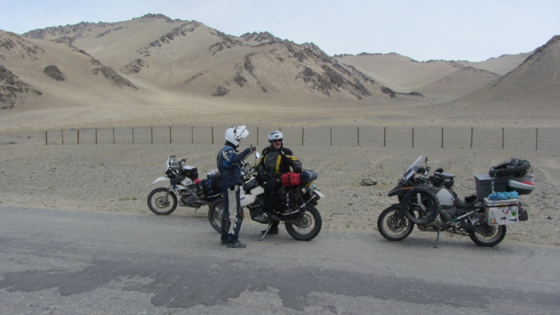 Dann zogen wir weiter, dem nächsten Highlight entgegen, dem Einstieg ins Bartang Tal. Die Straße war zunächst weiter Piste, doch irgendwann ging es wieder in schlechten Asphalt über. Plötzlich tauchte an der rechten Seite ein Zaun auf, zuerst fragte ich mich was das soll hier oben von Nutzen sein, dann viel mir ein, wir sind direkt an der chinesischen Grenze und dieser Zaun markiert den Grenzstreifen. Allerdings wohl eher theoretischer Natur, weil hier bestimmt keiner Interesse hat, mal eben nach China rüber zu machen, weil hinterm Grenzzaun ist nichts weiter als Gebirge. Aber schon eigenartig das Gefühl, quasi so dicht an China unterwegs zu sein.