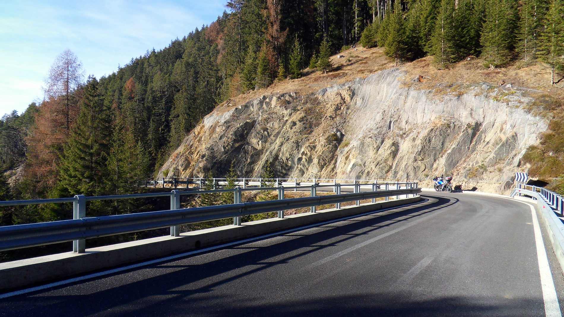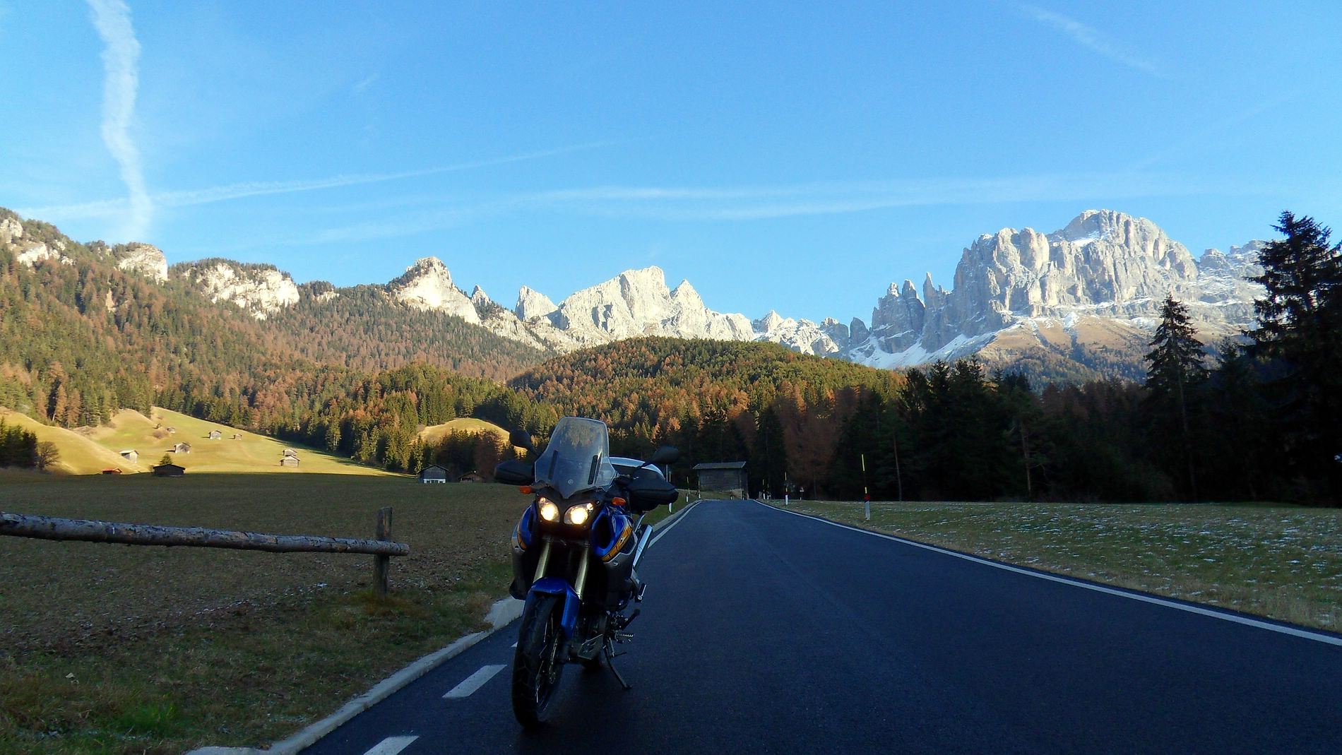 Erst um 9°° abgefahren weil ich mich nicht entscheiden konnte wohin also erst mal bis nach Scharnitz ( A ) bei Temp. um die 2° Brenner hoch oben nen Cappo gehoben und mein TOM TOM gefragt wos den nun hin gehen sollte. Beim durchblättern der Pässe ist mir Steinegg eingefallen die LS 132 führt Richtung Karerpaß also obige Weg Punkte eingegeben und schon war die Planung fertig.Landstr bis Bozen Nord dann in Prato links in die Gostnerwiese und schon kanns losgehen . die LS132 bis Steinegg muß ein Motorradfahrer " kreiert" haben gespickt mit 180° Kurven ein Genuss im Sommer aber heut kann man die Straße nur als" Feucht Gebiete " bezeichnen. aber was solls. In der Routenplanung habe ich als nächsten Punkt die LS 131 eingegeben ein Leckerli für Kurven Fans sie zweigt von der LS132 ab und endet in der SS241 die nach Welschnofen führt und weiter zum KarerSee ( Super Strecke ) der schon Zugefroren war weiter zum Paß hoch vorbei am Biker Hotel CASTEL LATEMAR und erst mal ein Platzerl zum Jausen gesucht und bei einem Hotel fündig geworden ein dicker Holztisch mit Urigen Stühlen kommt da grad Recht. Bei sonnigen 16° und Wolken losem Himmel in dieser tollen Bergkulisse zu sitzen ist einfach gigantisch, keine Touris oder Busse mit Japanern und auch kein Akropovic, Sebring oder Remus Geraüsche. Weiter gehts über die Via Nigra ( SP 65 ) zum Rosengarten und Nigerpaß. Alles wie ausgestorben trotz Kaiserwetter. Ein weiteres Schmankerl ist die Tirser Landstr. mit Dauerblick aufs Bergmassiv und vielen Kurven die sich wieder an den Ausgangs Ort bei Bozen schlängeln. Durch Bozen durch zum Sarntal und übers Penserjoch ( übrigens noch offen falls noch jemand Lust hat ) zum Brenner schnell getankt ( 1.39,9 ) und Heim gehts.
