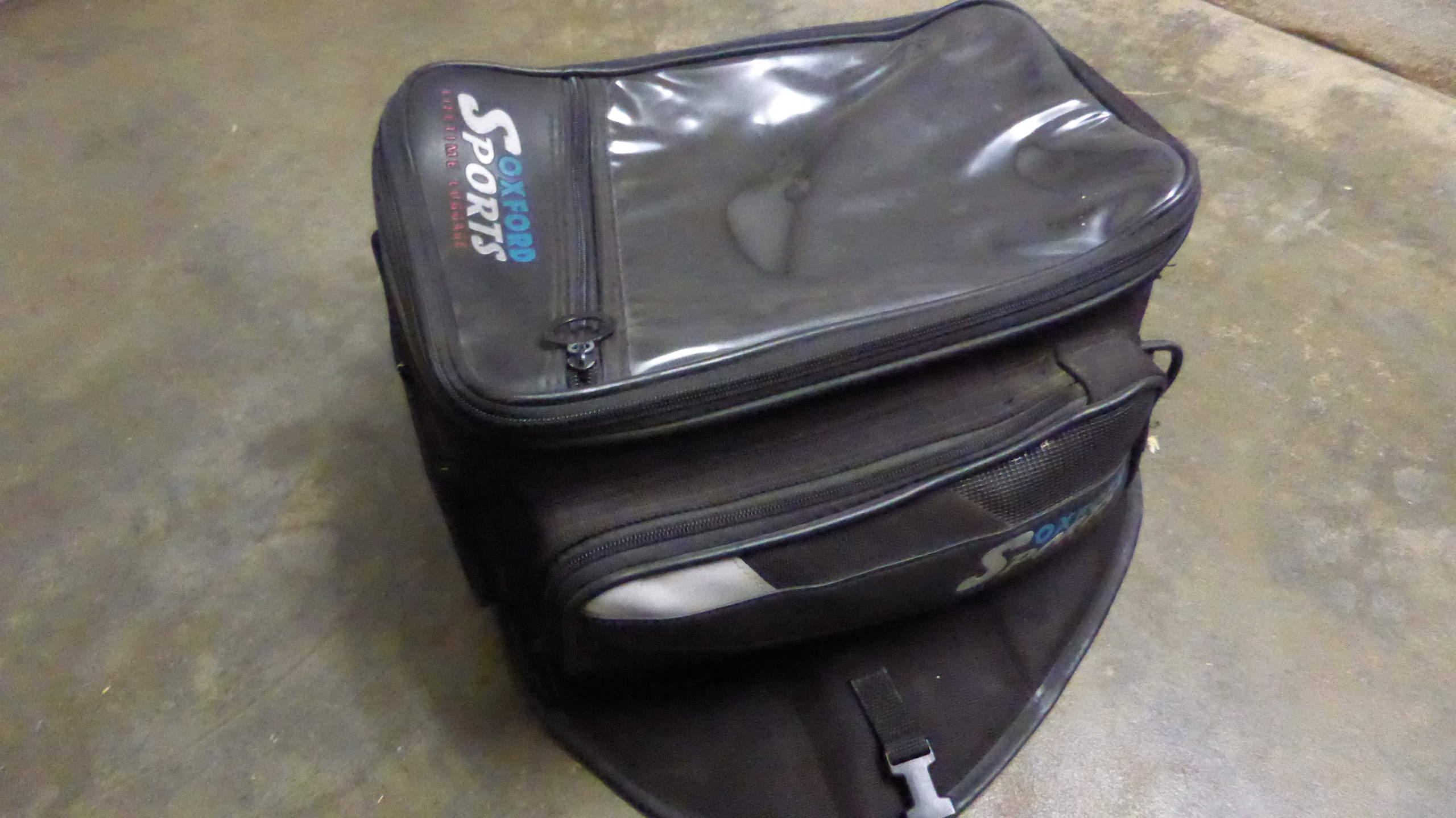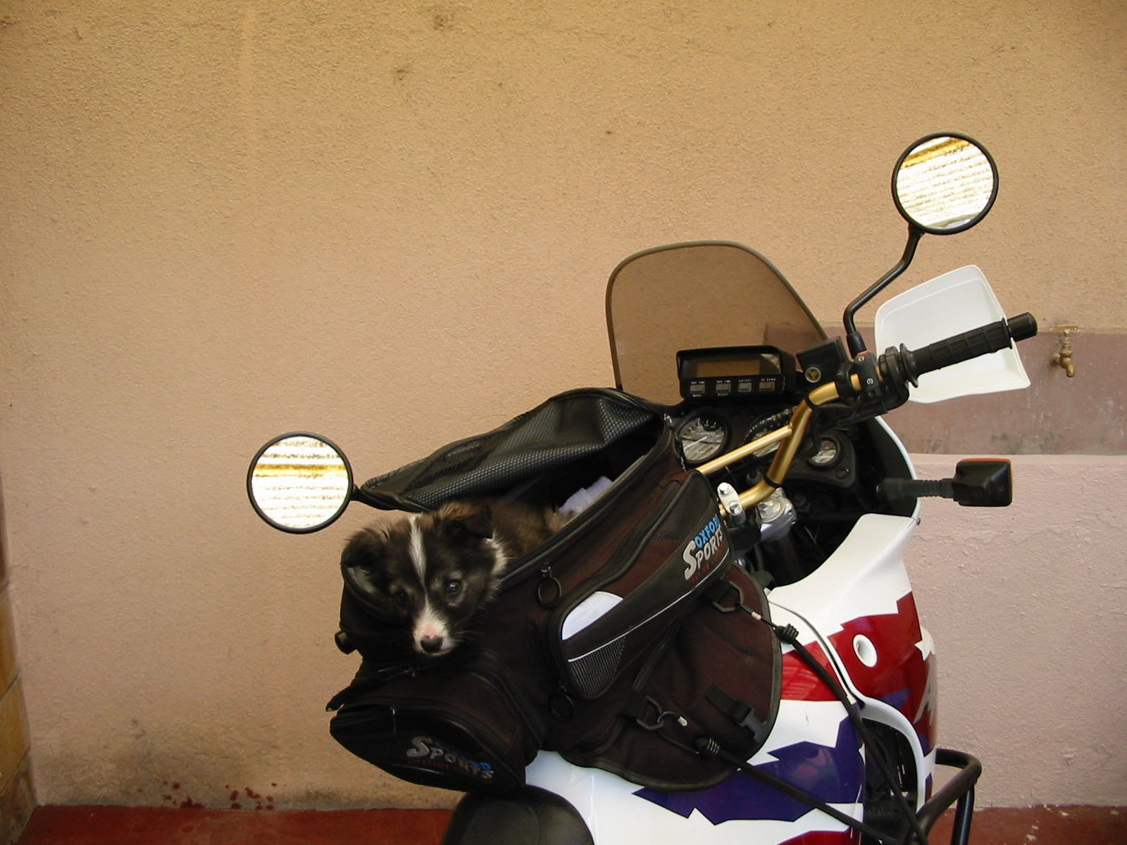 2000 kaufte ich bei Honda in Köln meine Africa samt Zubehör. Darunter auch ein Tankrucksack der Marke Oxford. Der Waschzettel innen ist schon lange ver"..." (versessen, abgesessen?), also hinüber, denn da war immer ein Hund drauf.