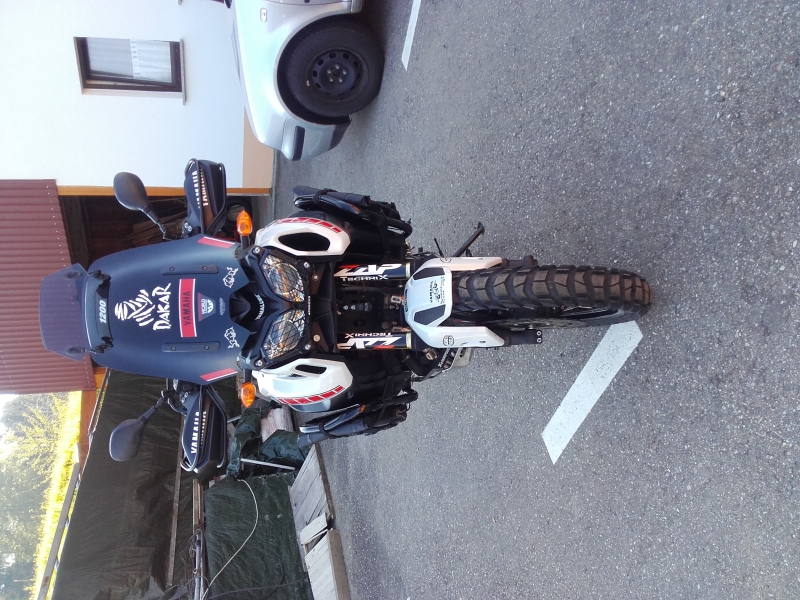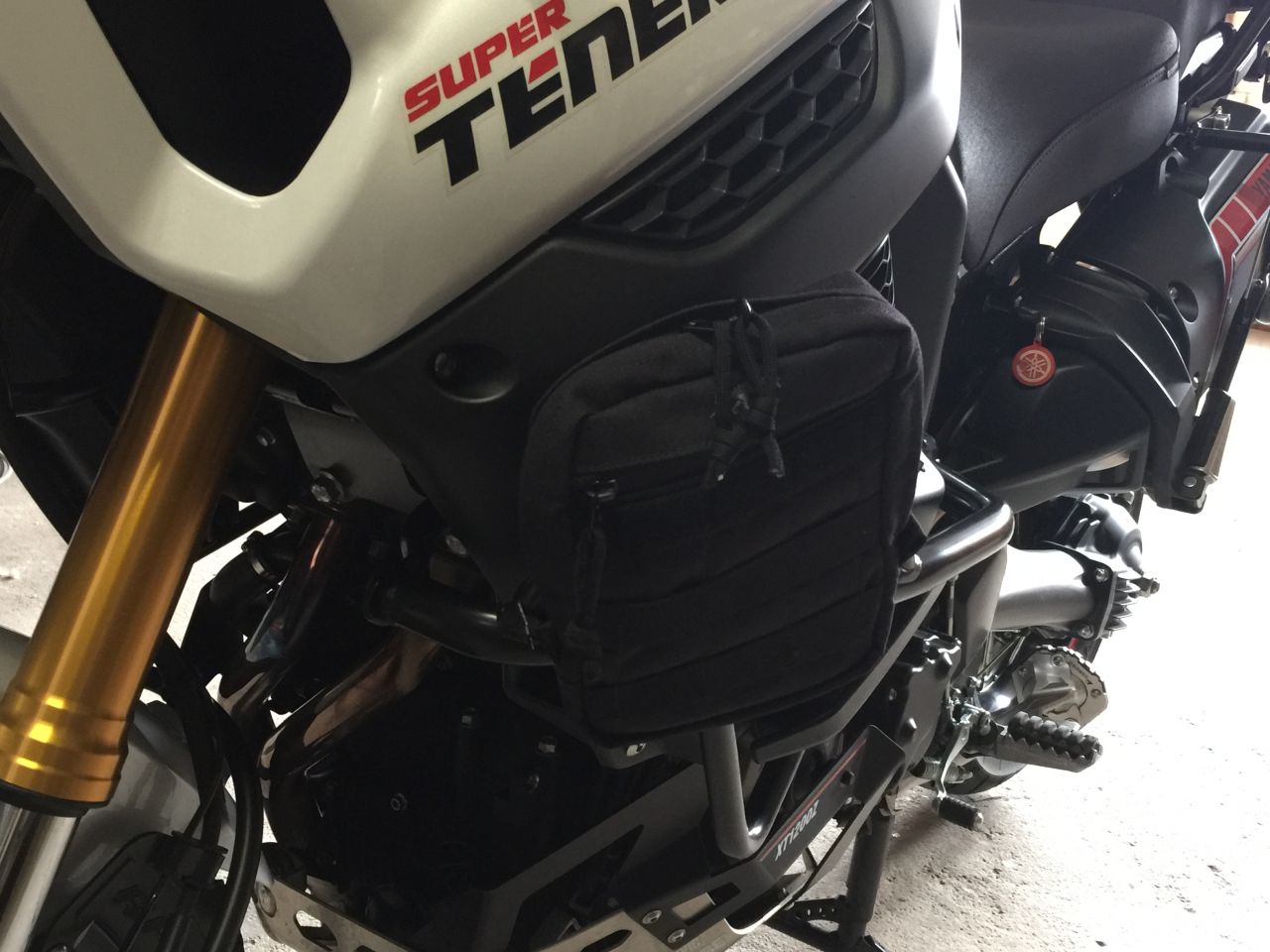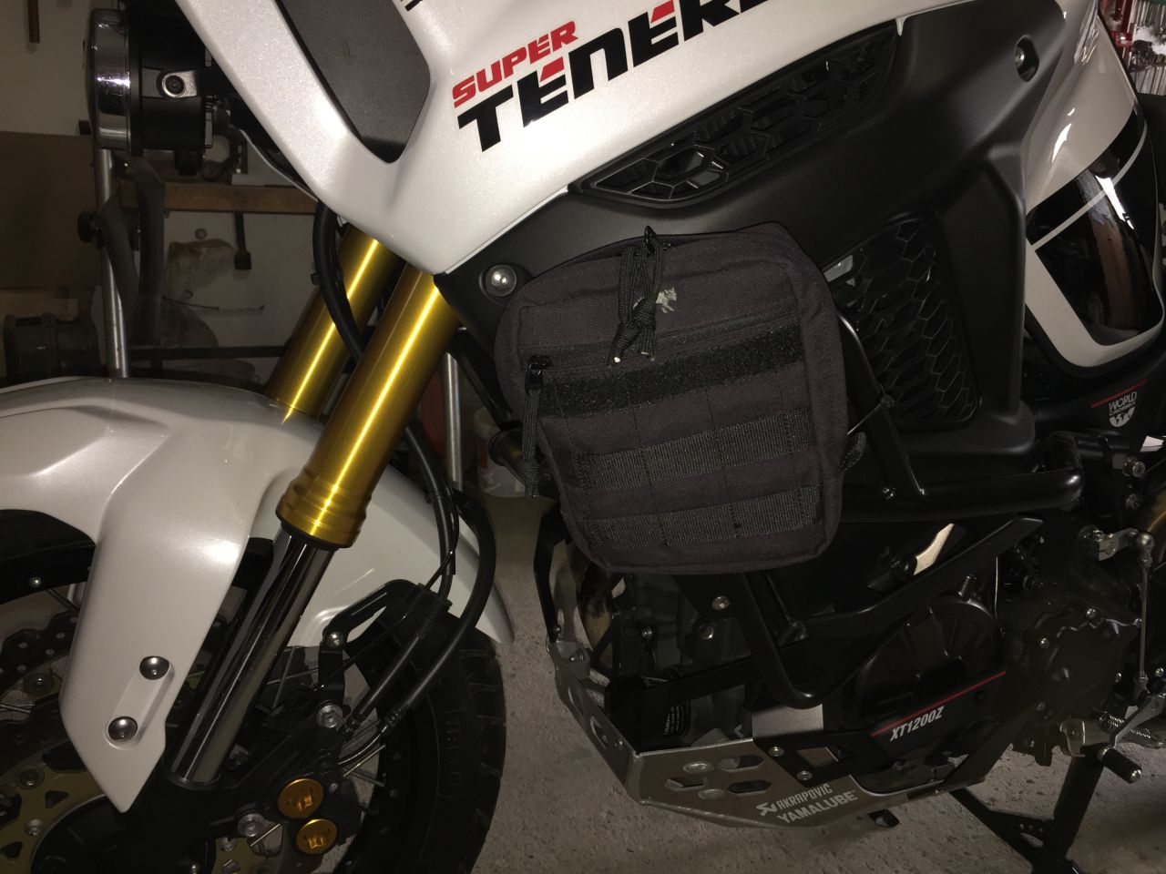 inspiriert von Gawi ist mir eingefallen, das ich auch noch eine Molletasche habe. Habe sie mal angebracht, leider ist sie sehr klein, reicht also gerade für Sonnenbrille, Papiere, Kippen, Ersatzhandschuhe oder ähnliches. Aus meiner "Schnabelendurozeit" weiß ich noch das man mit Kabelbinder viel machen kann, also habe ich sie damit zusätzlich fixiert und gegen schnelle mitnahme gesichert, hält super.