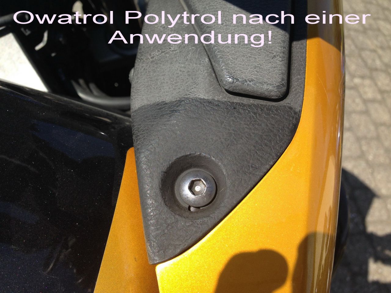Hier mal ein Vergleich Vorher/Nachher mit Owatrol Polytrol an der Kunststoffverkleidung an einer HONDA Varadero. Ich benutze das Owatrol Polytrol mittlerweile für viele Kunststoffteile und muss sagen das Zeug ist super, weil´s halt dauerhaft den Kunstoff pflegt. Übrigens kann man Owatrol Polytrol auch auf Metall verwenden. Wo wir wieder beim Thema Salz frisst wären - sicherlich ein guter Schutz vor diesem!juergen007 hat geschrieben:Kunststoffteile: Floh danke für den Tipp. Dieses Pflegemittel war mir neu.