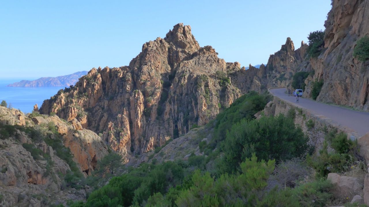 Und genau das war der Plan für Donnerstag. Gestartet wurde wieder um 7.30 Uhr, um den Touri-Reisebussen aus dem Weg zu gehen. Busse gab es keine, aber Schweine ohne Ende. Die Viecher nutzten auch die Gunst der Stunde, um frei über die Straßen laufen zu können. Es war traumhaft den Pass ohne Verkehr und ohne Regen hoch zu fahren. Auf der Abfahrt auf der anderen Seite konnte ich sogar einige Fotostopps einlegen. Bereits um 8.40 Uhr waren wir an den Calanches. Touris und Busse waren nicht vor Ort, aber viele Radfahren. Und die Radfahrer kamen uns sehr bekannt vor. Das waren dieselben, die wir am Sonntag an der Nordostküste überholt hatten. Radfahrer stellen aber für Motorradfahrer kein größeres Hindernis dar.