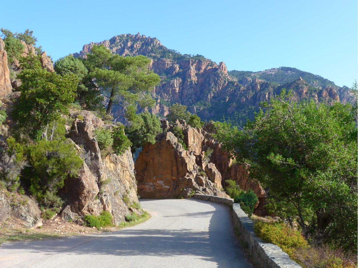 Bereits um 8.40 Uhr waren wir an den Calanches. Touris und Busse waren nicht vor Ort, aber viele Radfahren. Und die Radfahrer kamen uns sehr bekannt vor. Das waren dieselben, die wir am Sonntag an der Nordostküste überholt hatten. Radfahrer stellen aber für Motorradfahrer kein größeres Hindernis dar.