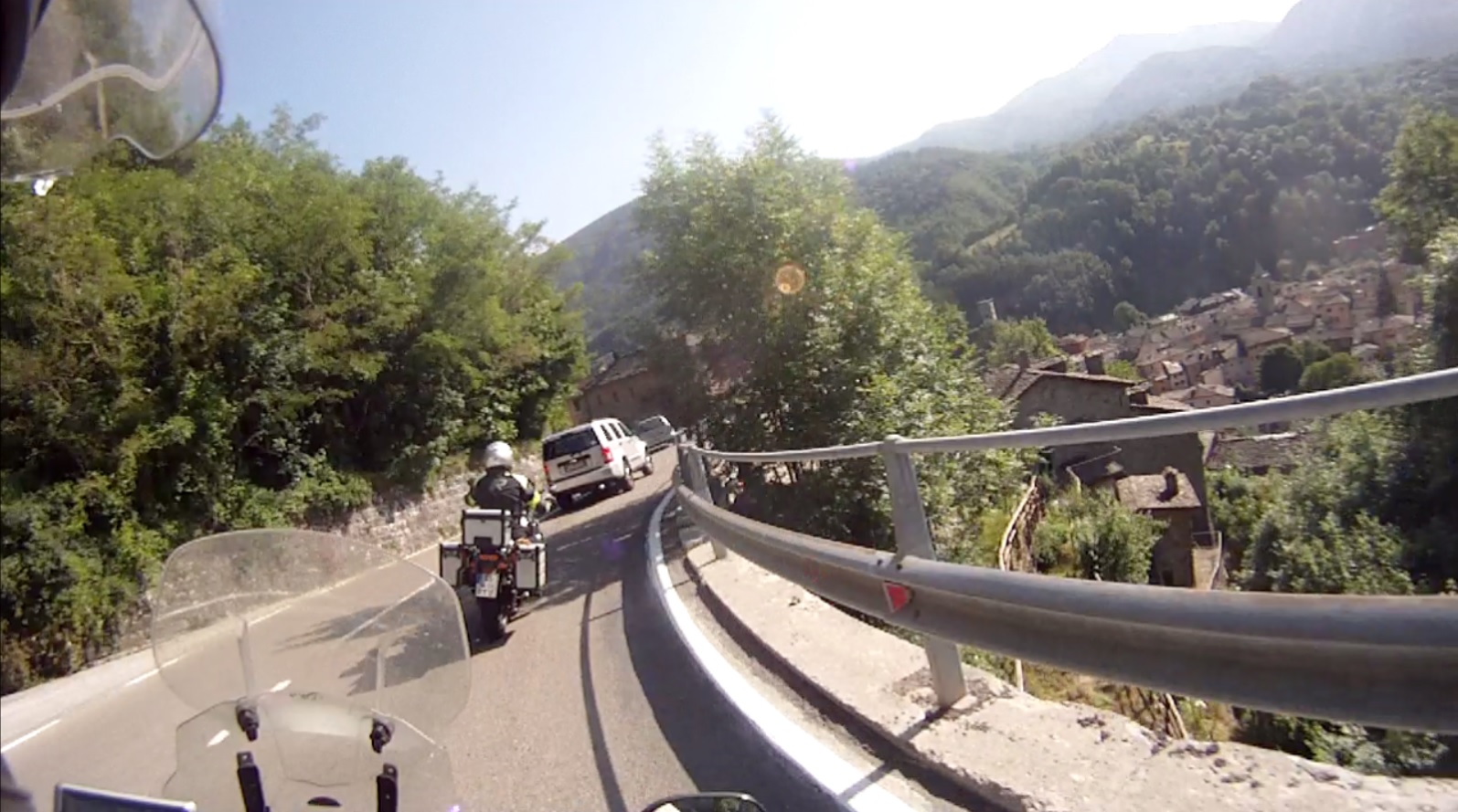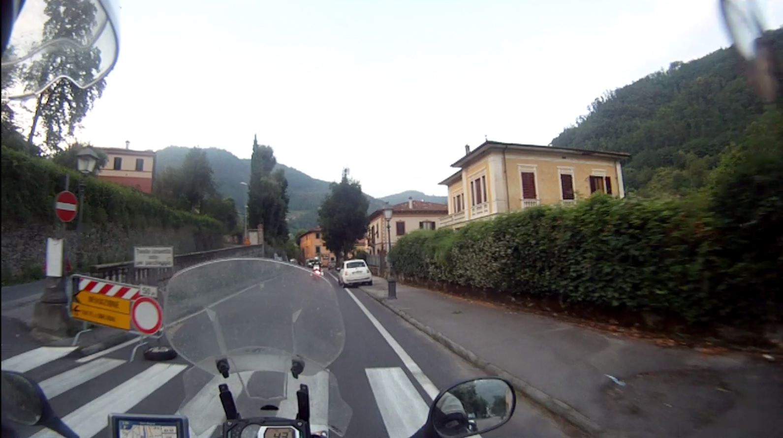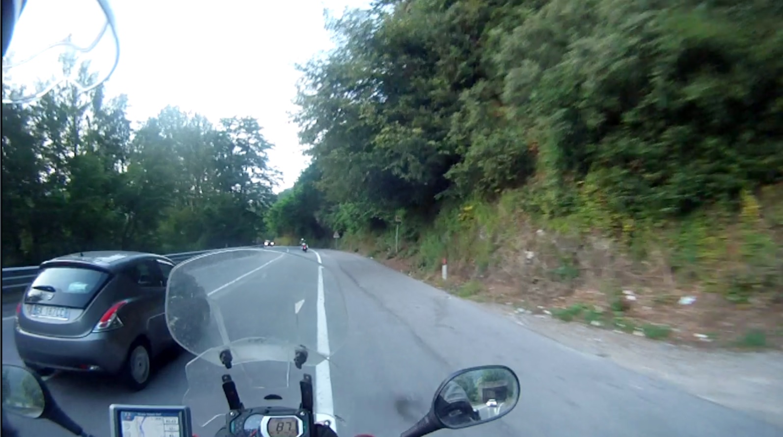 Und schon ging es wieder los. Italiener können einfach nicht hinter Motorrädern fahren. Sie müssen überholen, auch wenn es weder Sinn macht, noch ohne Risiko von Statten geht. Trotz Überholverbot und obwohl der kaum etwas nach vorne sah, musste so ein Schwachkopf sich vorbeizwängen. Weil seine Scheißkarre kaum PS hatte, reichte es natürlich nicht und er schnitt mich so brutal, dass ich bremsen und nach rechts ausweichen musste.